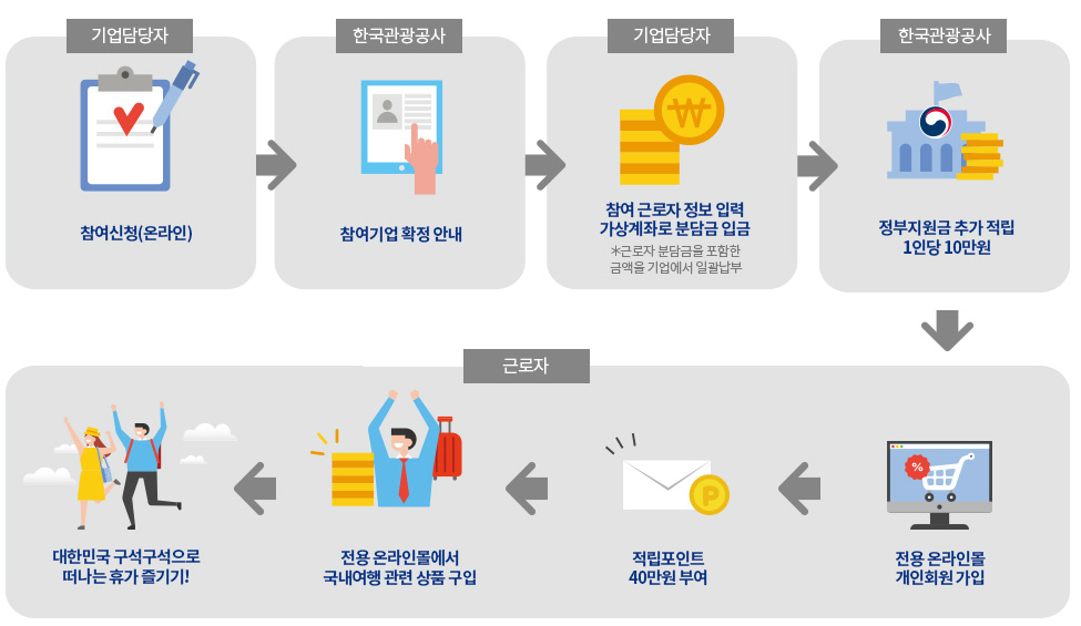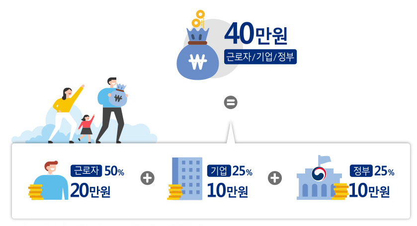 근로자가 20만원을 분담하면 정부가 10만원 기업(고용주)이 10만원을 추가로 지원하여 여행 적립금 40만원을 적립해 줍니다. (근로자 20만원 + 고용주 10만원 + 정부 10만원 = 총 40만원)