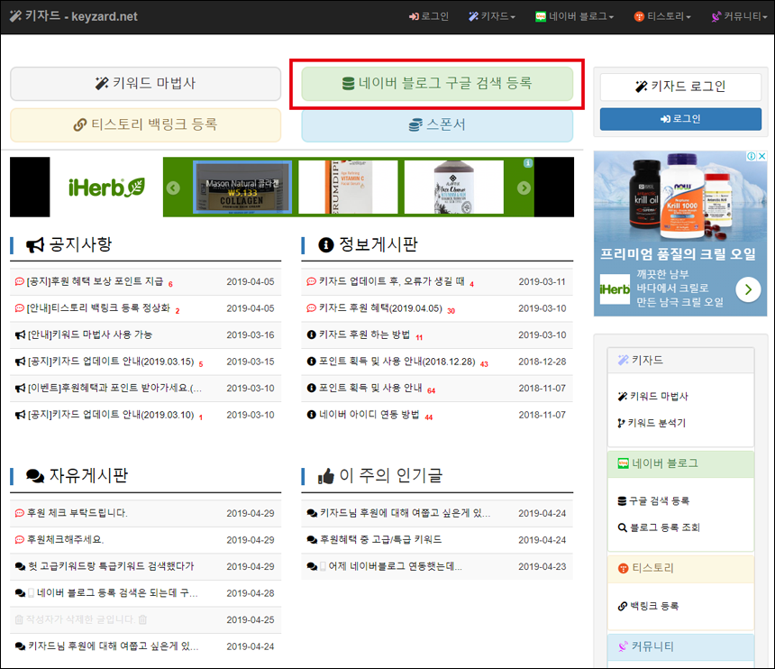 키자드 사이트 메인에서 [네이버 블로그 구글 검색 등록] 메뉴를 클릭