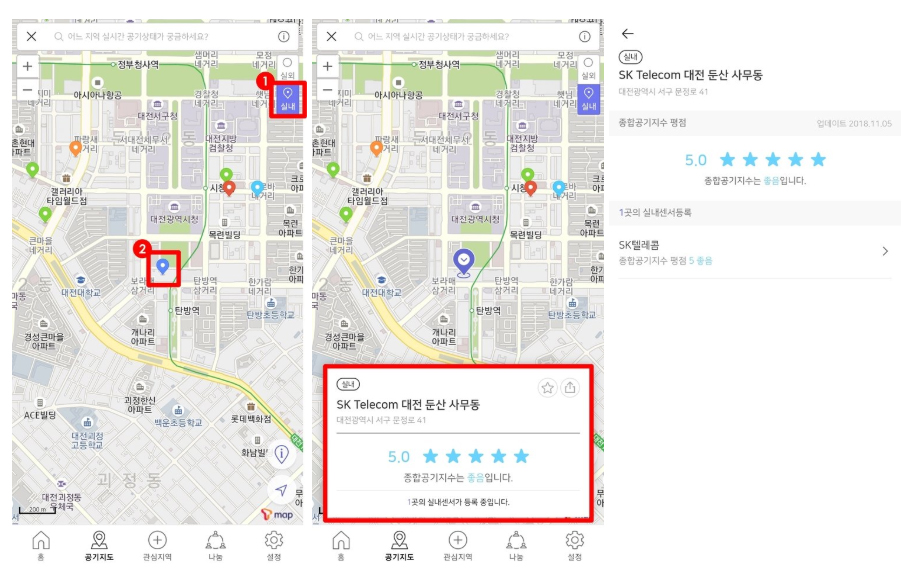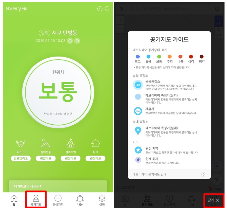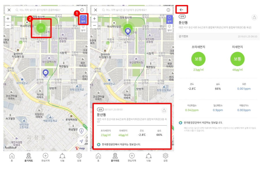 공기지도 메뉴에서는 지역별 공기 정보를 실시간으로 확인이 가능하며