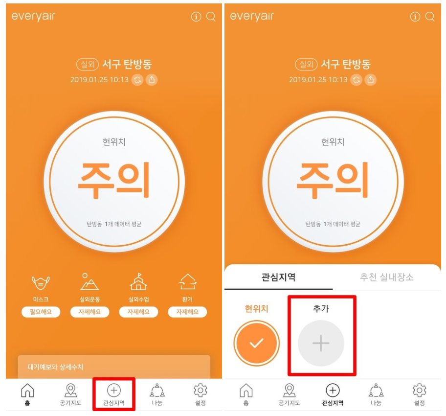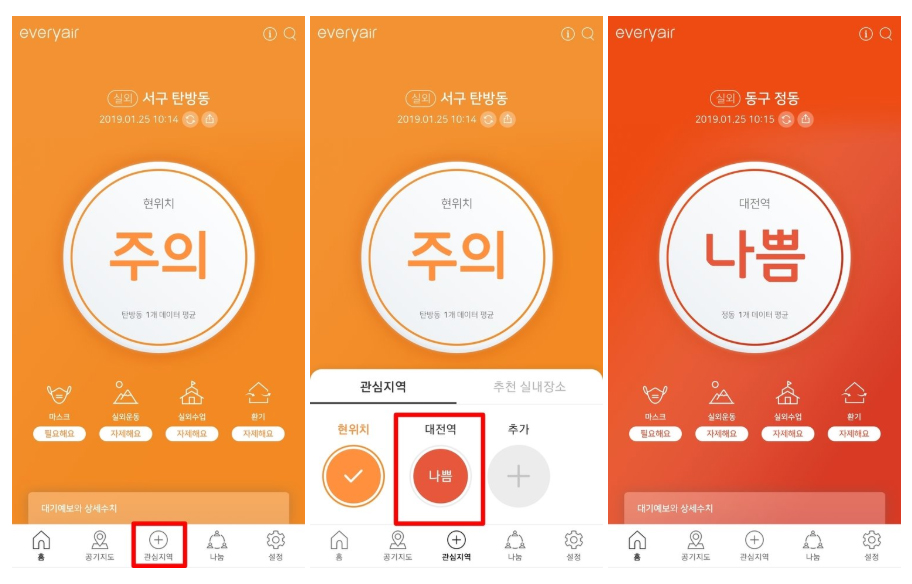 화면 하단의 관심지역을 누르면 추가한 장소의 공기 정보도 함께 확인할 수 있습니다.