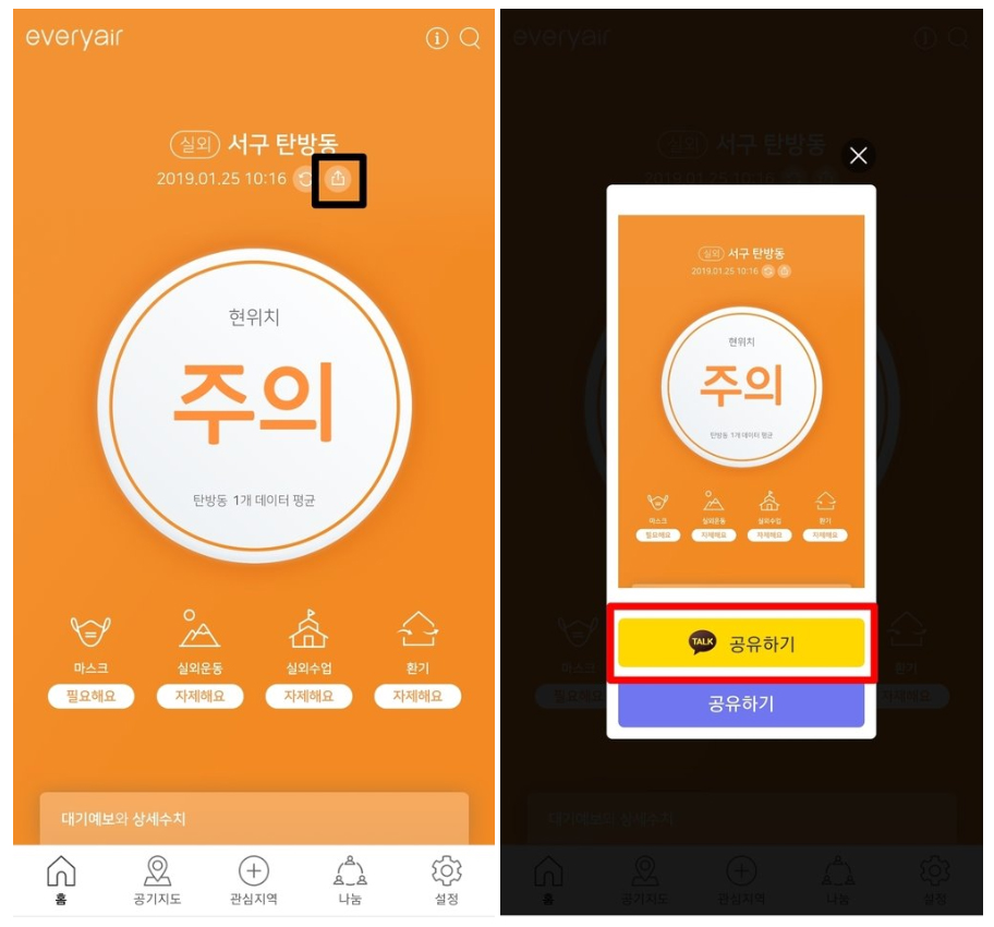 에브리에어의 공유하기 기능으로 현재 공기 정보를 다른 사람에게 알려줄 수 있습니다.