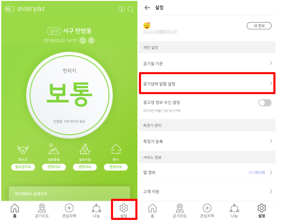 설정 > 공기상태 알림 설정으로 들어갑니다.