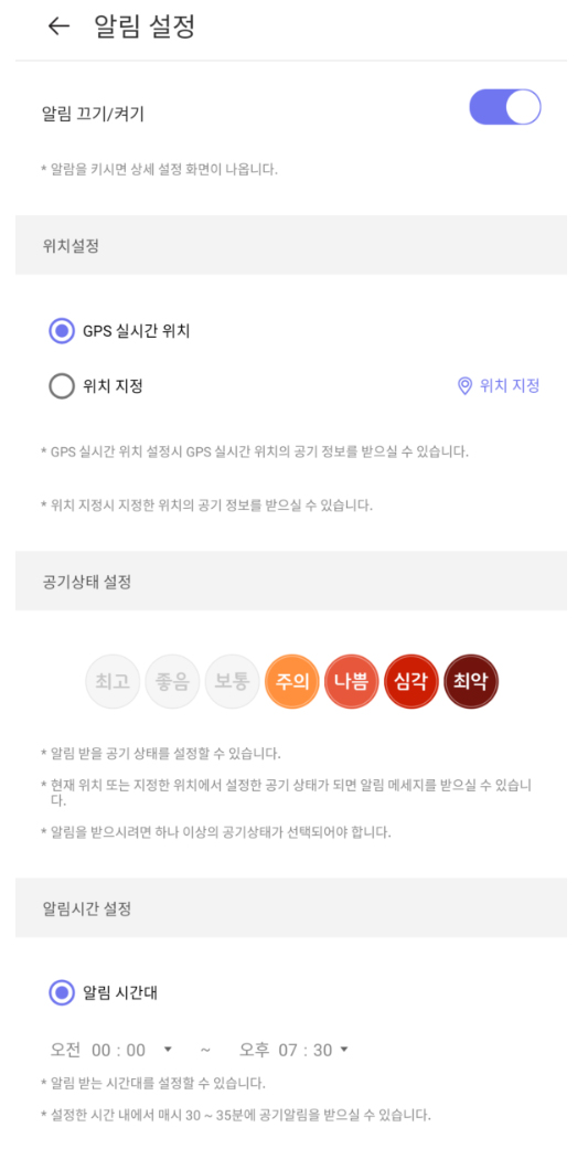 알림설정에 알림을 켜면 위치, 알림 받을 공기 상태, 알림 시간을 상세하게 설정할 수 있습니다.