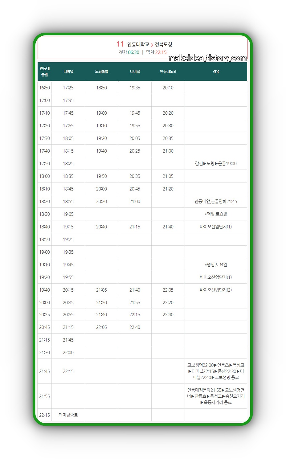 평소에 안동 시내 버스를 이용하는 분들은 매번 버스는 타는 시간이 비슷하기 때문에 문제가 없을 것 같은데, 평소에 안동시내버스를 이용하지 않는 분들은 특히 토요일과 공휴일 시간표를 잘 체크해야 무작정 기다리는 일이 줄어들 것 같다.