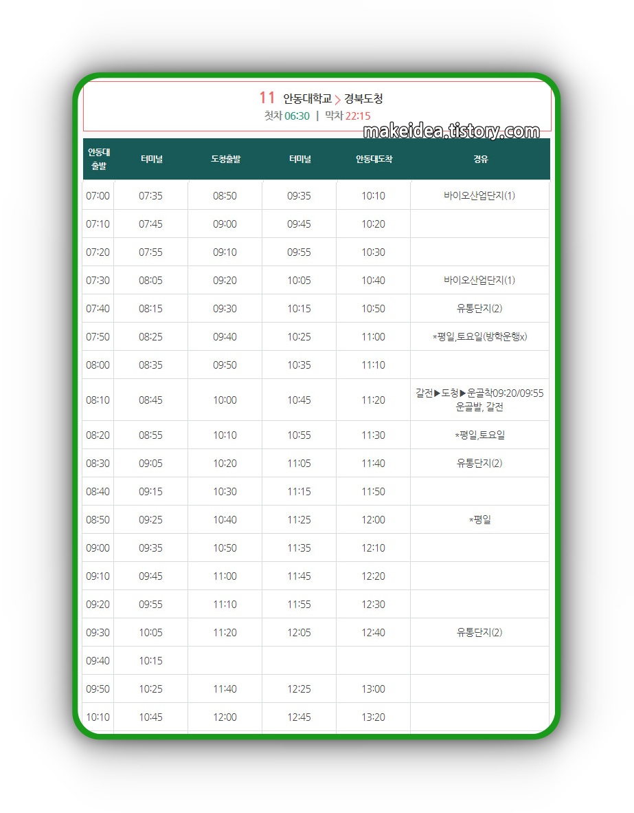 안동 시내버스 11번 책임 운송사인 안동버스에서 공지한 내용을 보면 3가지 평일과 토요일, 방학 때 평일과 토요일 그리고 일요일과 공휴일 운행으로 학기중과 방학 때 그리고 휴일에 운행되는 버스 시간이 일부 차이가 난다는 것이다.
