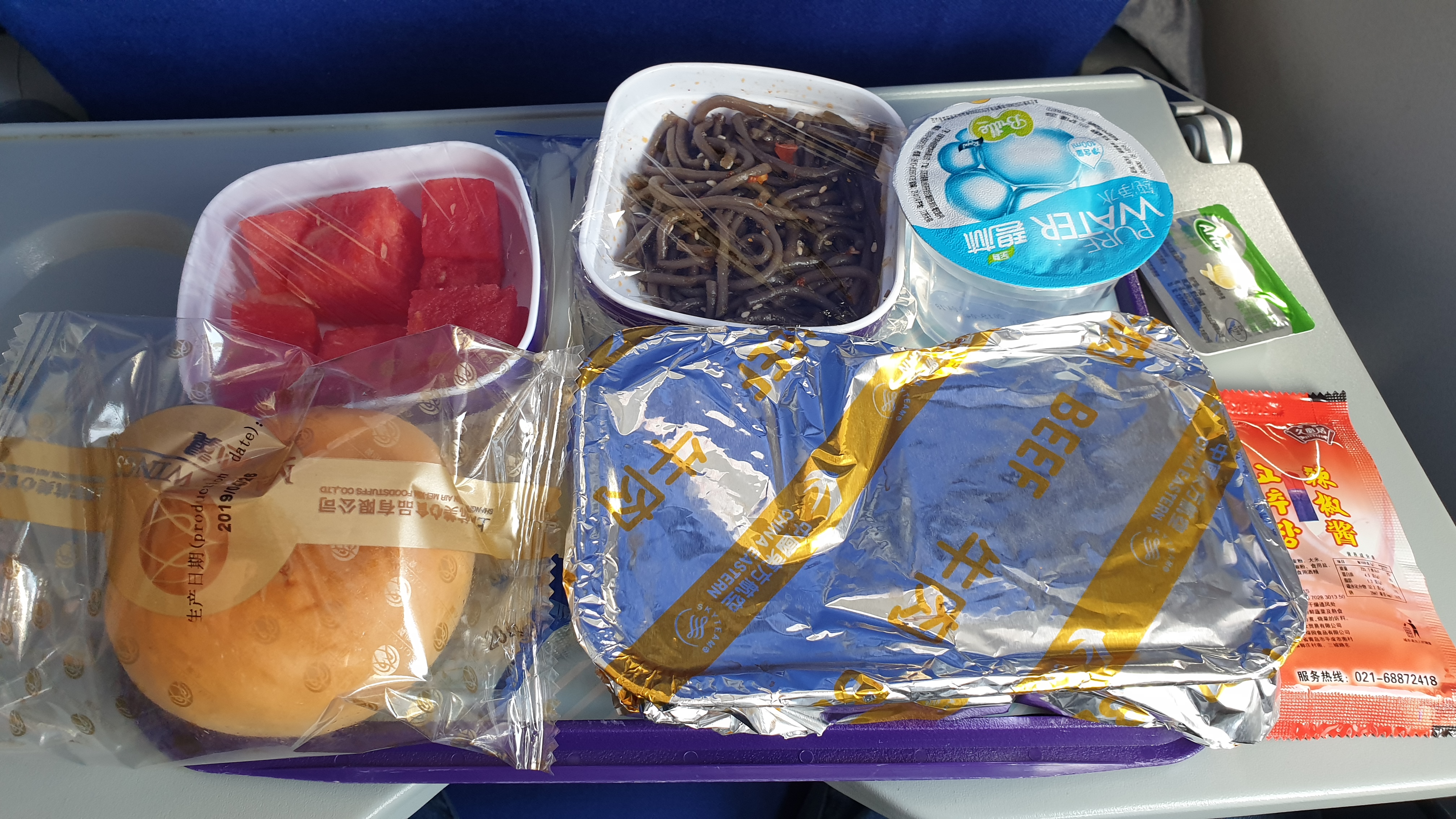 막 시작한 비를 맞으면서 비행기는 대구를 향하고, 가장 맛있는 요리는 시장기라고 했던가, 기내에서 먹는 조식도 괜찮네. 중국동방항공은 기내에 생수병을 무료로 제공해준다.