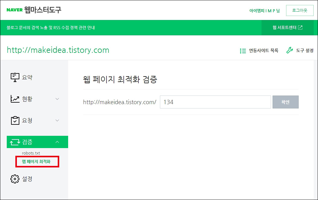 웹페이지 최적화로 들어가서 최적화 검증을 해본다.