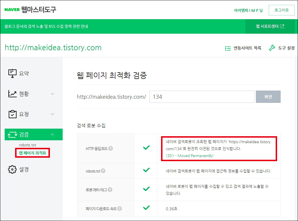 네이버 웹마스터도구 HTTP 응답코드 확인