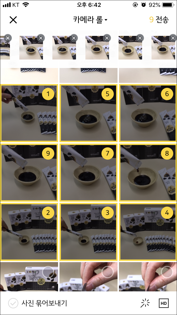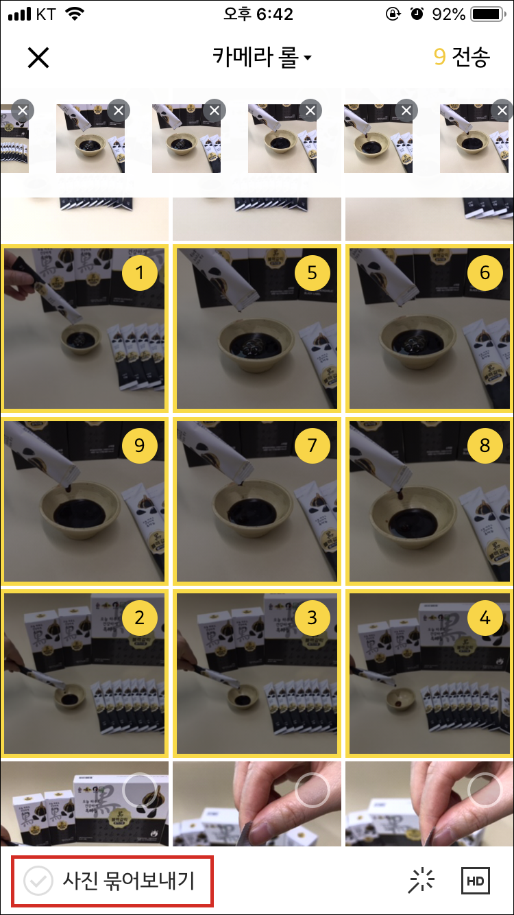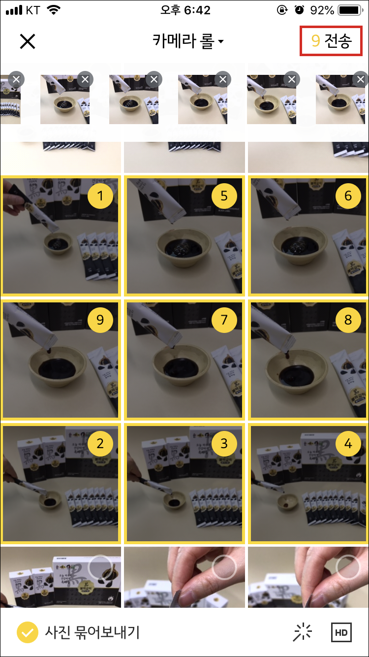 전송할 사진을 선택하는데, 중요한건 선택한 "선택한 순서대로 사진이 정렬된다"는 것