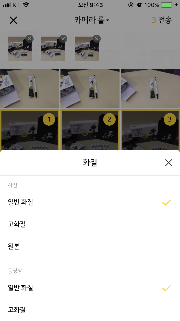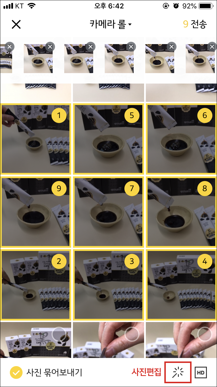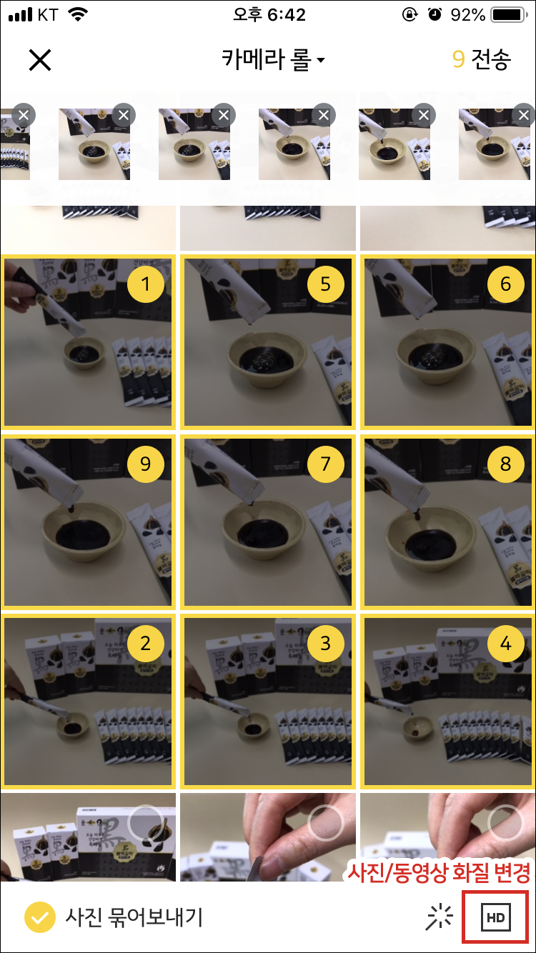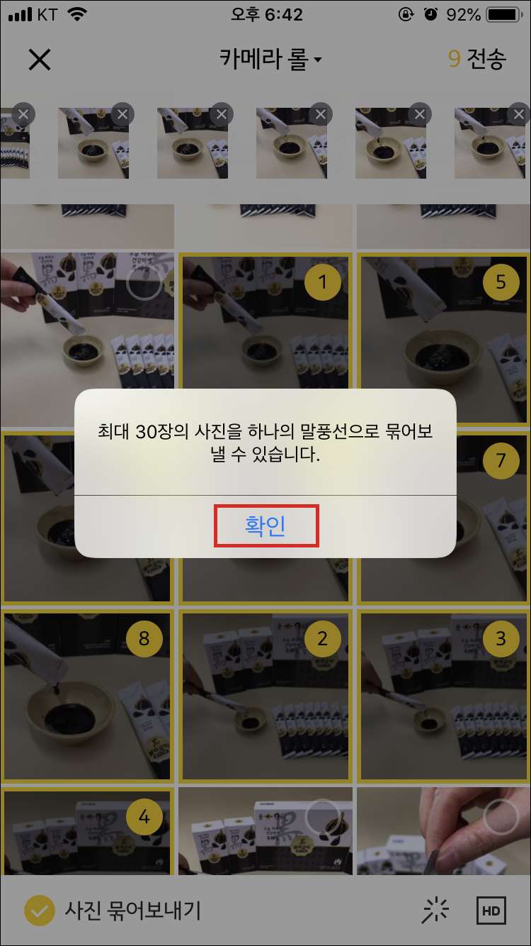 전송할 사진을 선택하는데, 중요한건 선택한 "선택한 순서대로 사진이 정렬된다"는 것