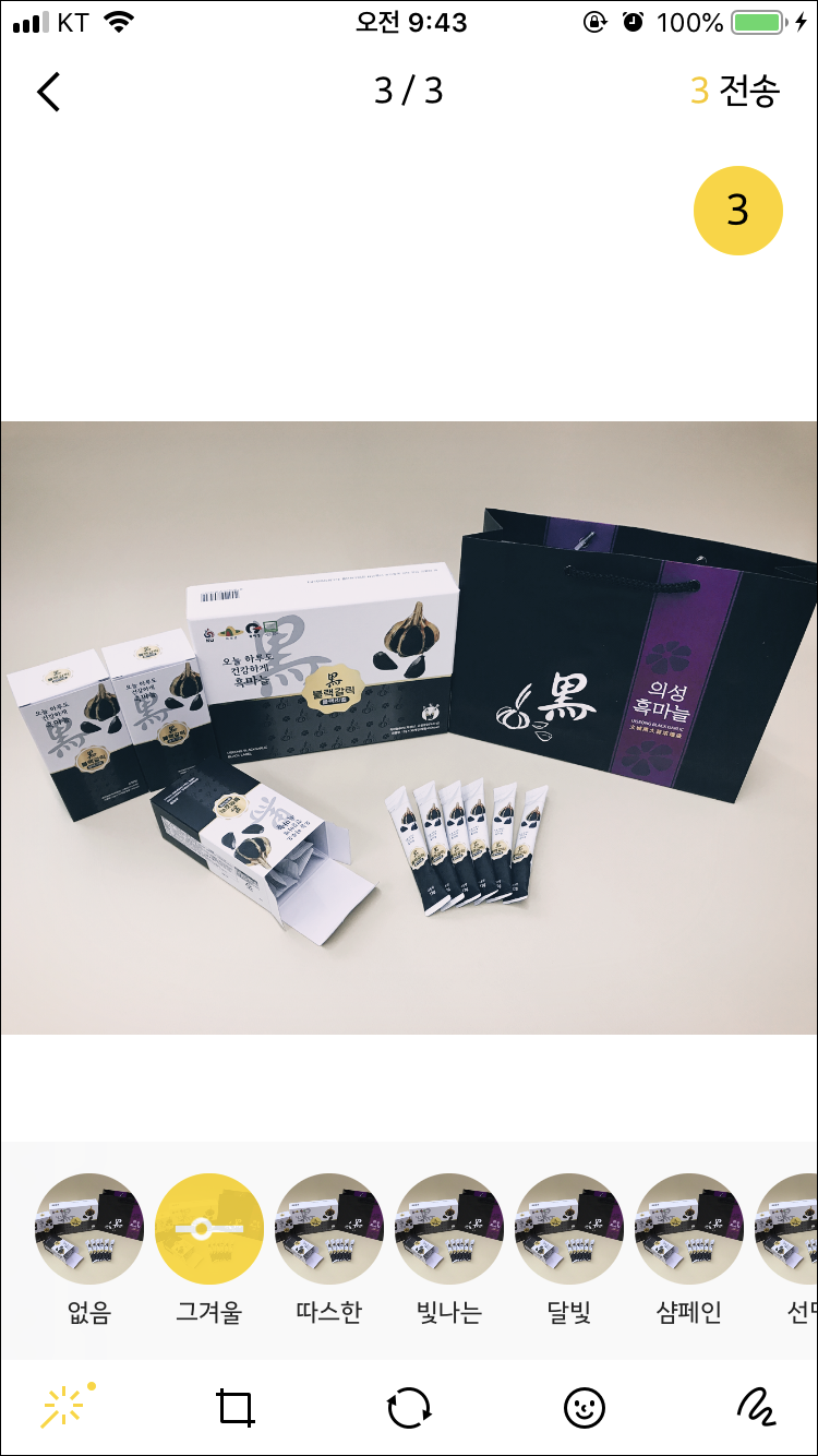 필터 적용, 자르기, 회전, 스티커삽입 등의 편집을 할 수 있다.