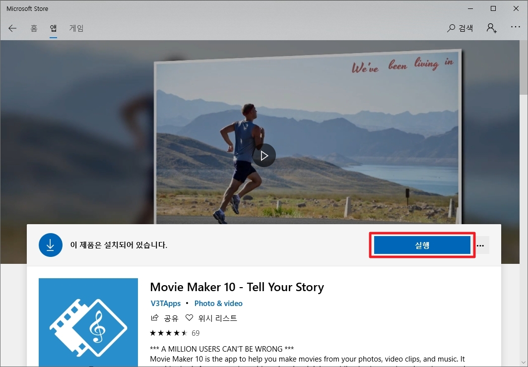 간단하게 사진 이어붙여 동영상 만들기나 동영상 변환 같은 간단한 기능만 필요하다면 윈도우 스토어에 들어가서 앱으로 무비메이커 무료 버전을 설치해 사용할 수 있다.