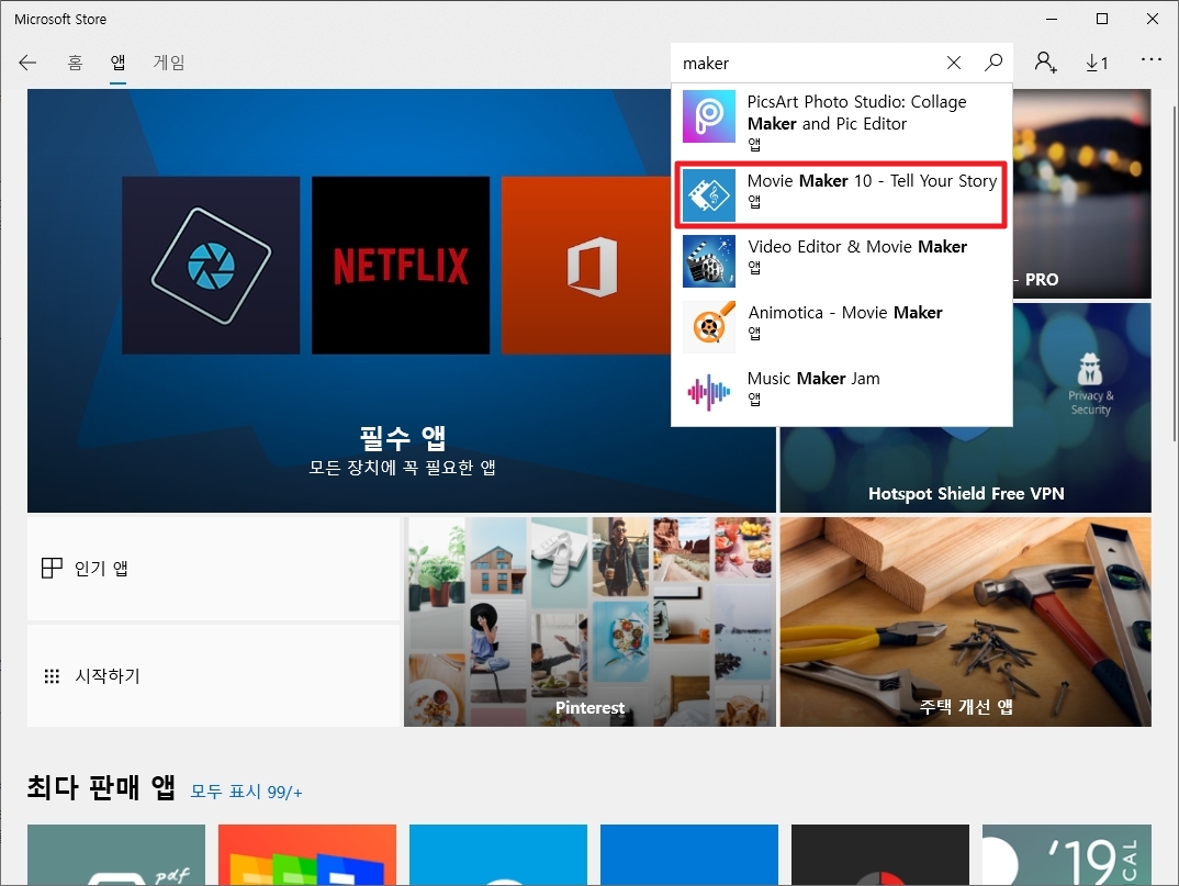 검색 버튼을 누르고 [maker]로 검색하면 Movie Maker 10 이란 이름으로 검색이 된다.
