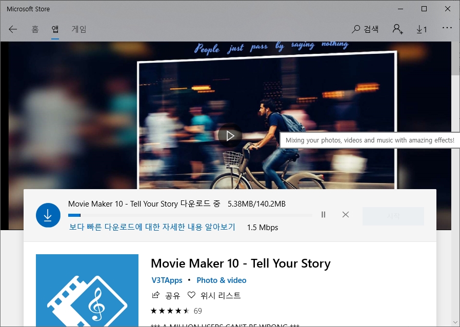 간단하게 사진 이어붙여 동영상 만들기나 동영상 변환 같은 간단한 기능만 필요하다면 윈도우 스토어에 들어가서 앱으로 무비메이커 무료 버전을 설치해 사용할 수 있다.