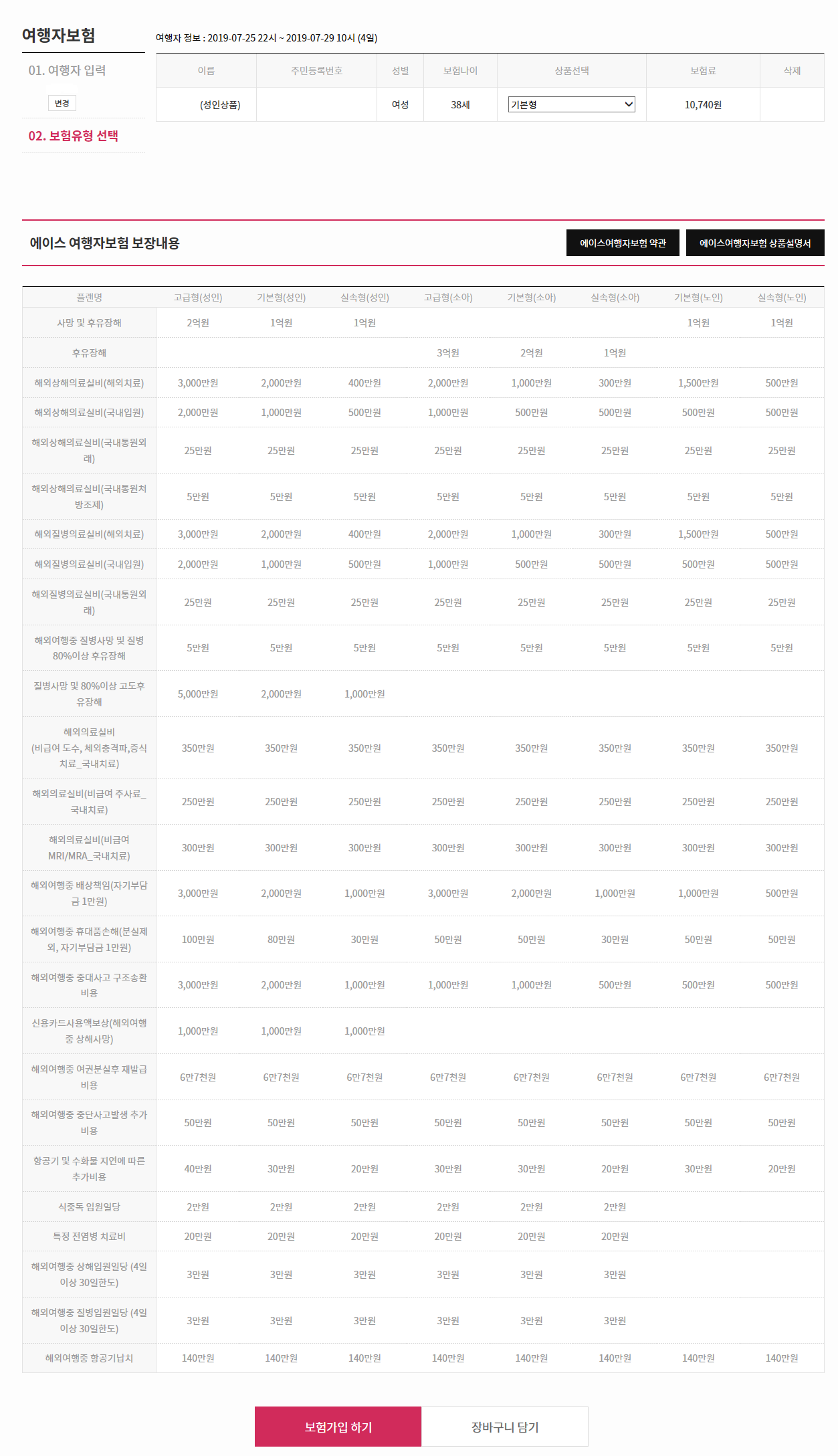 하나투어에서 에이스여행자보험 견적금액