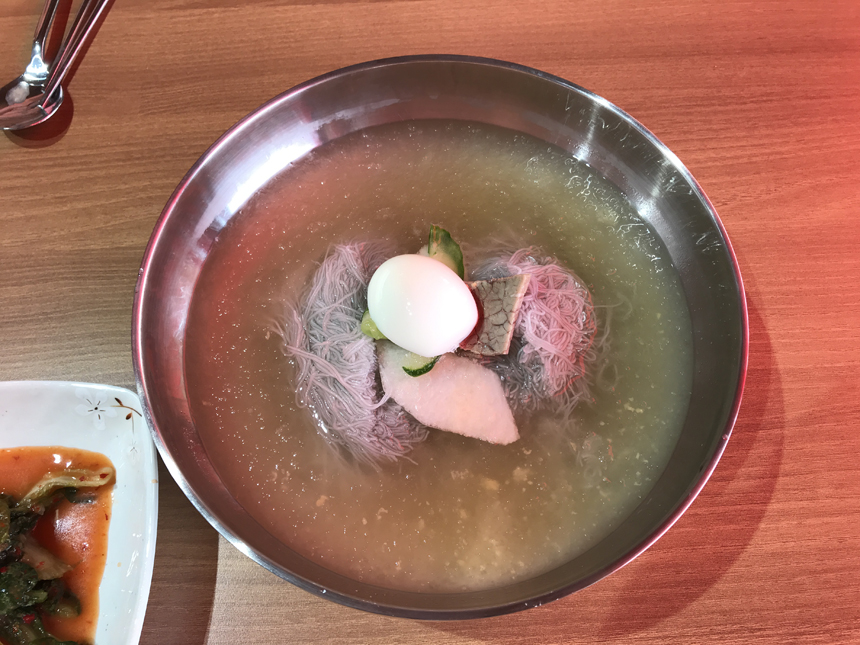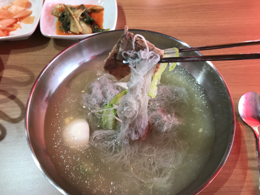 손으로 반죽해서 뽑았다는데 냉면 면이 진짜 실처럼 가늘고 탄력이 있었다.