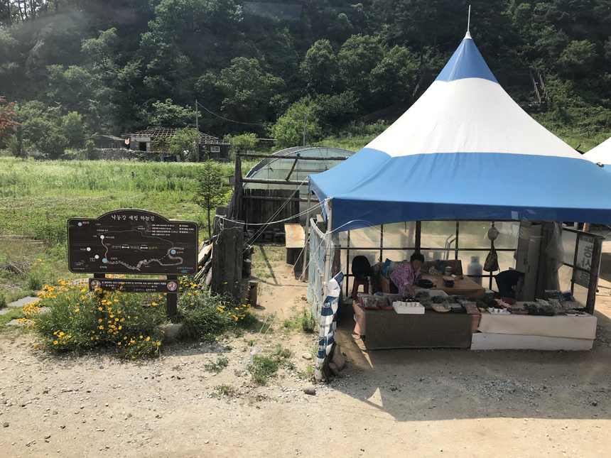 마을 주민들이 관광열차가 정차하는 시간에 맞춰 나와 산나물이나 강냉이 산딸기 같은 것들을 팔고 계신다.
