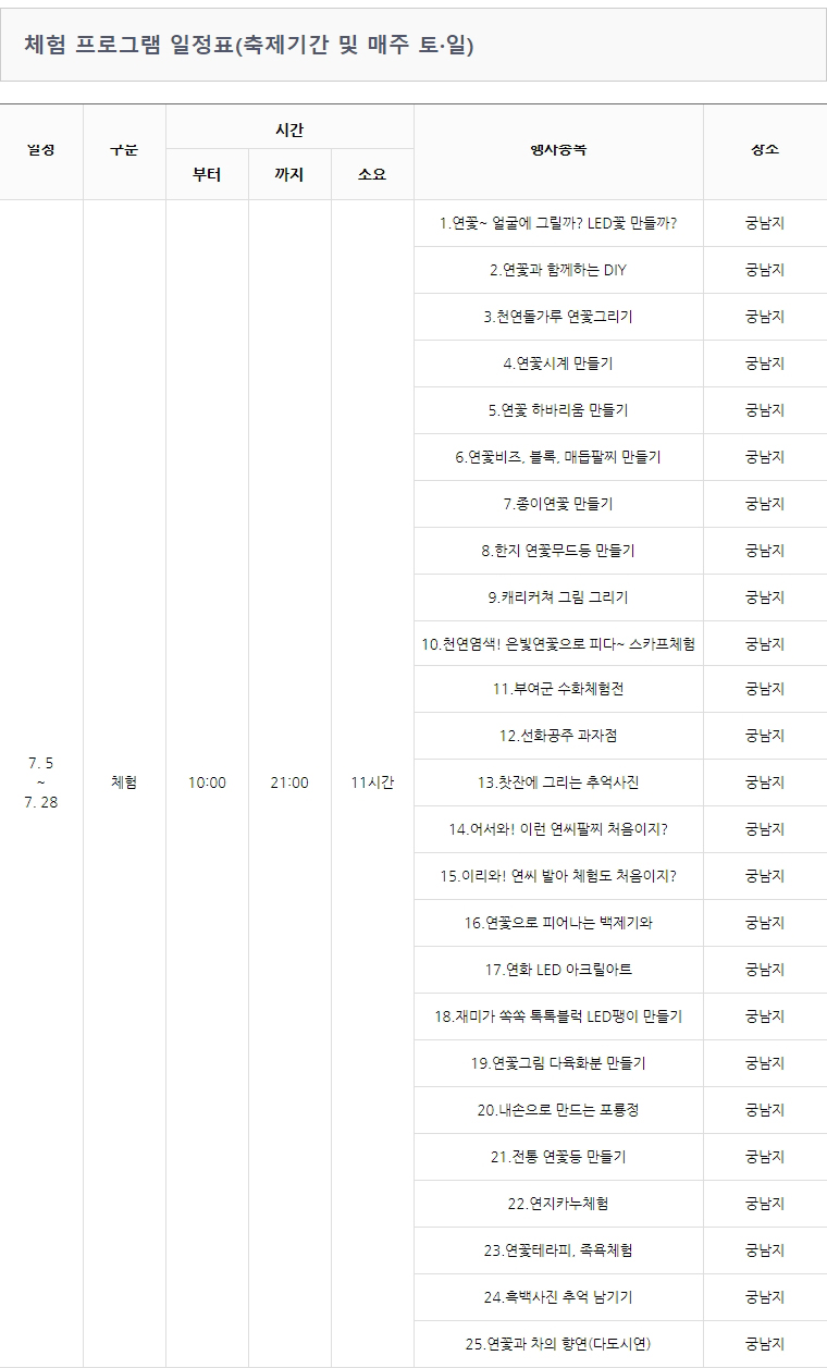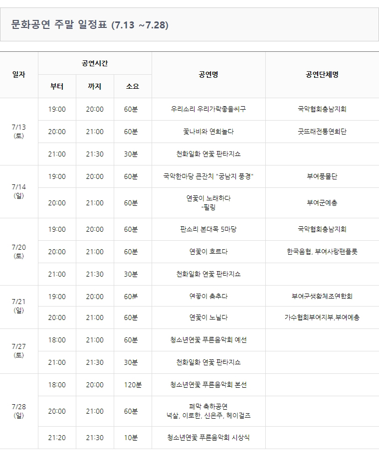 부여서동연꽃축제는 7월 주말마다 다채로운 공연과 행사들이 열린다고 하니 꼭 보고 오세요^^