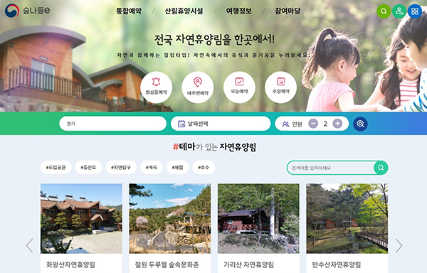 산림청이 전국 모든 자연휴양림을 한 곳에서 예약하고 결제까지 할 수 있는 통합 플랫폼 '숲나들e'를 개시하였습니다.