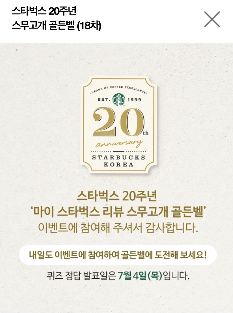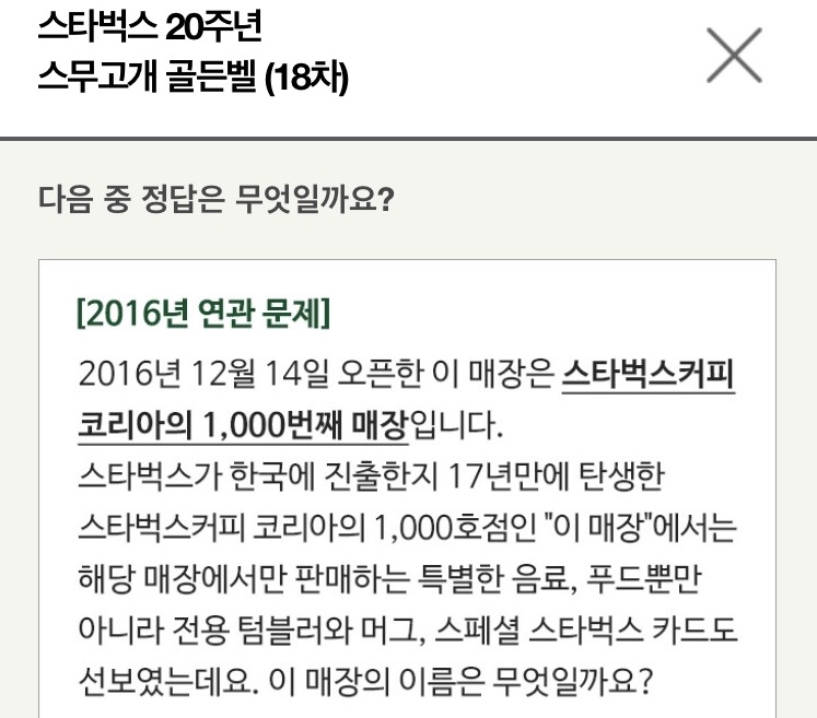 스타벅스 골든벨 18차 (6월28일) by 세상 밖으로 2019. 6. 28. 반응형 스타벅스 골든벨 18차 (6월28일) 18차정답 청담스타R 스타벅스 청담스타R에서 별적립 2배 받으세요 반응형 공유하기 게시글 관리 생각과 실천 댓글