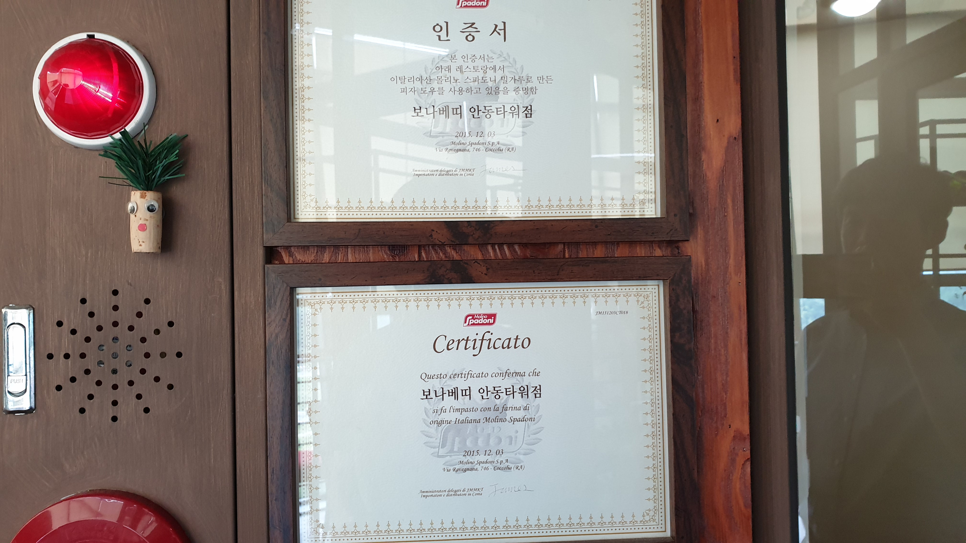 이탈리아산 몰리노 스파도니 밀가루로 만든 피자 도우를 사용함을 증명하는 인증서.