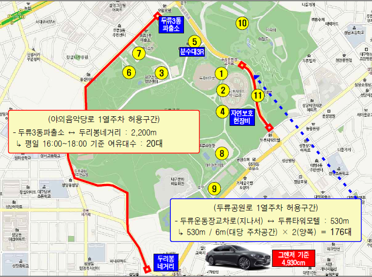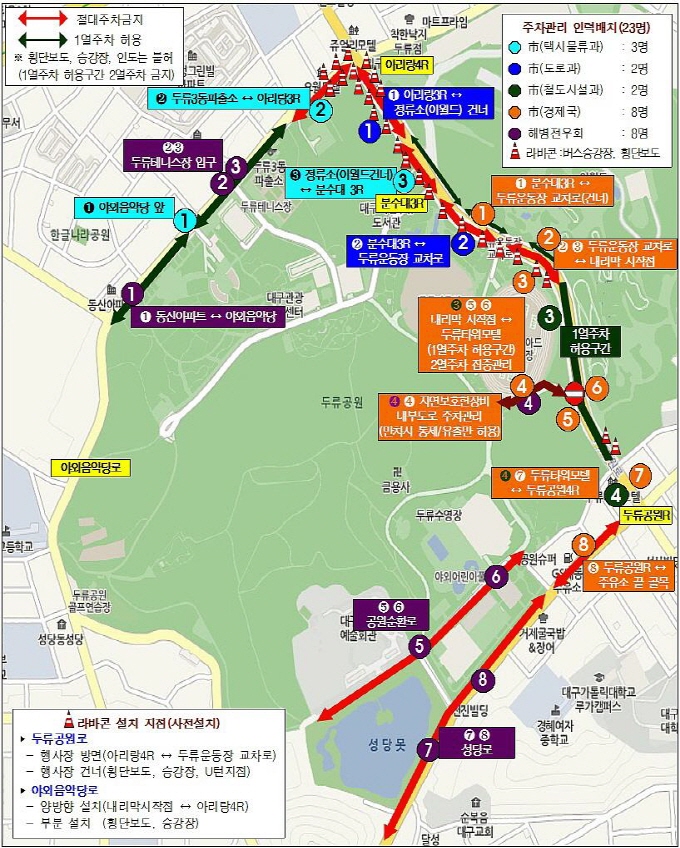 두류공원로 및 야외음악당로 일부 갓길을 임시 주차장으로 허용할 예정!