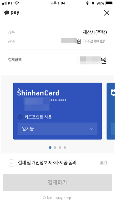 카카오페이에 등록된 카드 중 하나를 선택하고 [결제하기]