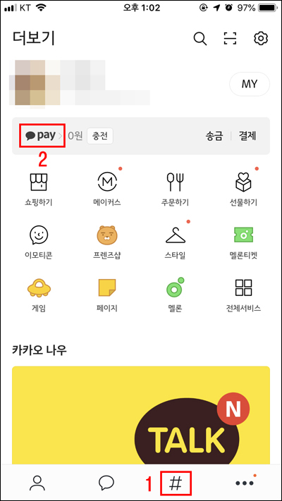 먼저 카톡앱을 열고 [#]을 눌러 메뉴가 있는 화면으로 가서 [pay]를 선택.