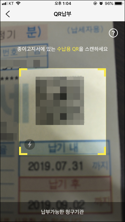고지서의 지로 용지에 있는 QR코드를 화면에 갖다대면 알아서 인식한다.