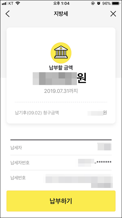 납세자 이름과 납세자 번호(주민번호), 납세번호, 금액을 확인한 후 [납부하기] 선택
