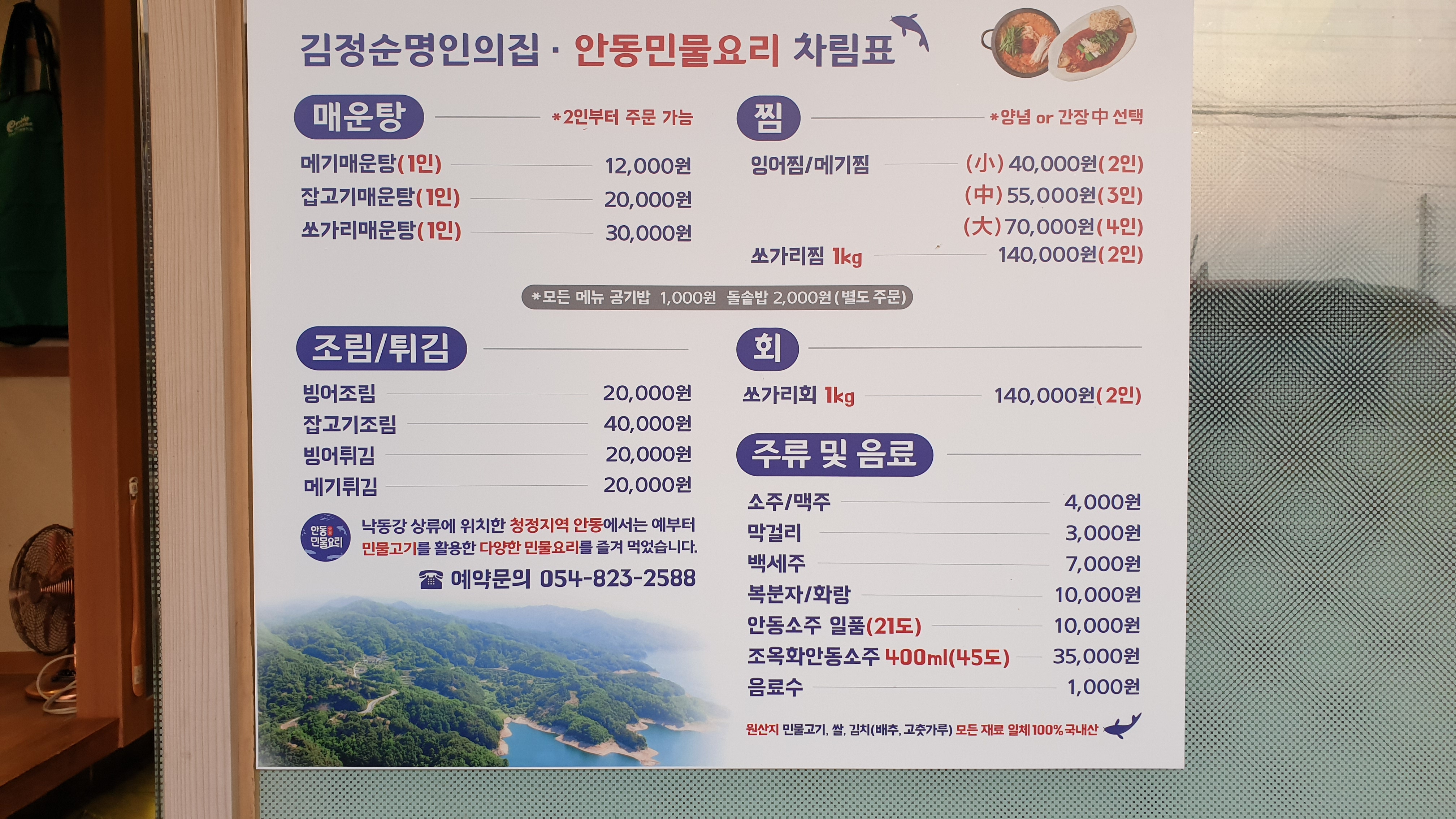 잉어찜, 메기찜, 쏘가리찜, 매운탕이 주 메뉴인 민물생선 전문 요리집이다.