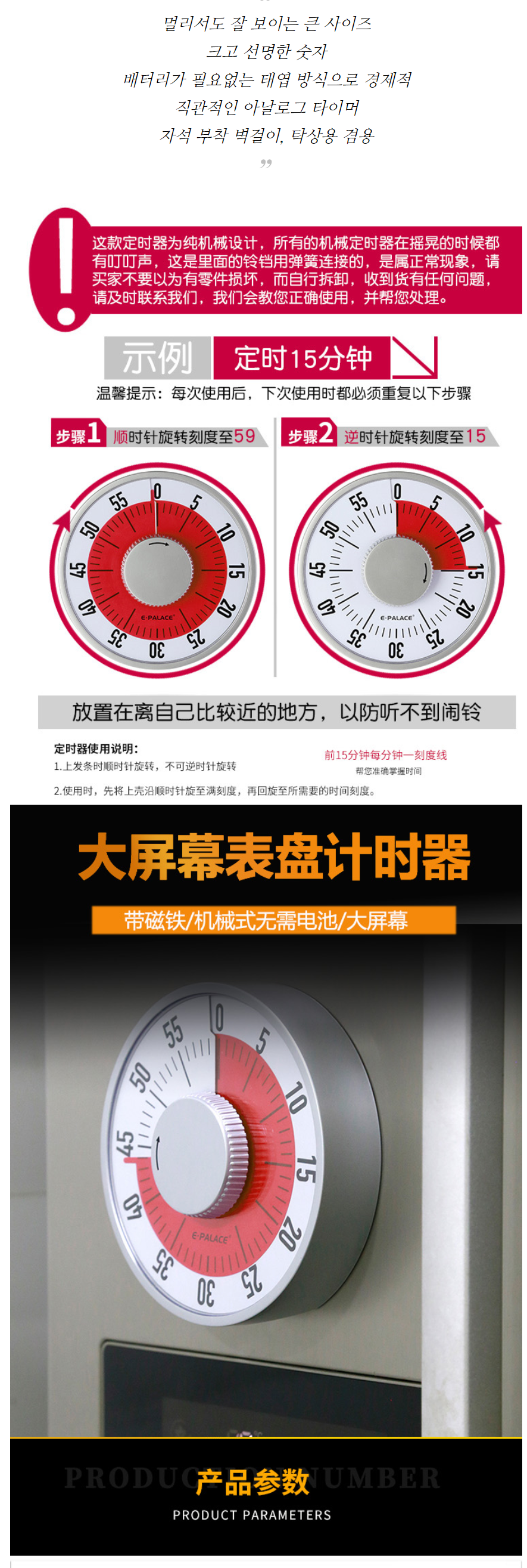 [해외직배송] 대륙의 타임타이머 자석 벽걸이 탁상용 겸용 교육용 학습용 주방용 쿠킹타이머 알람 시계 : 판다랜드