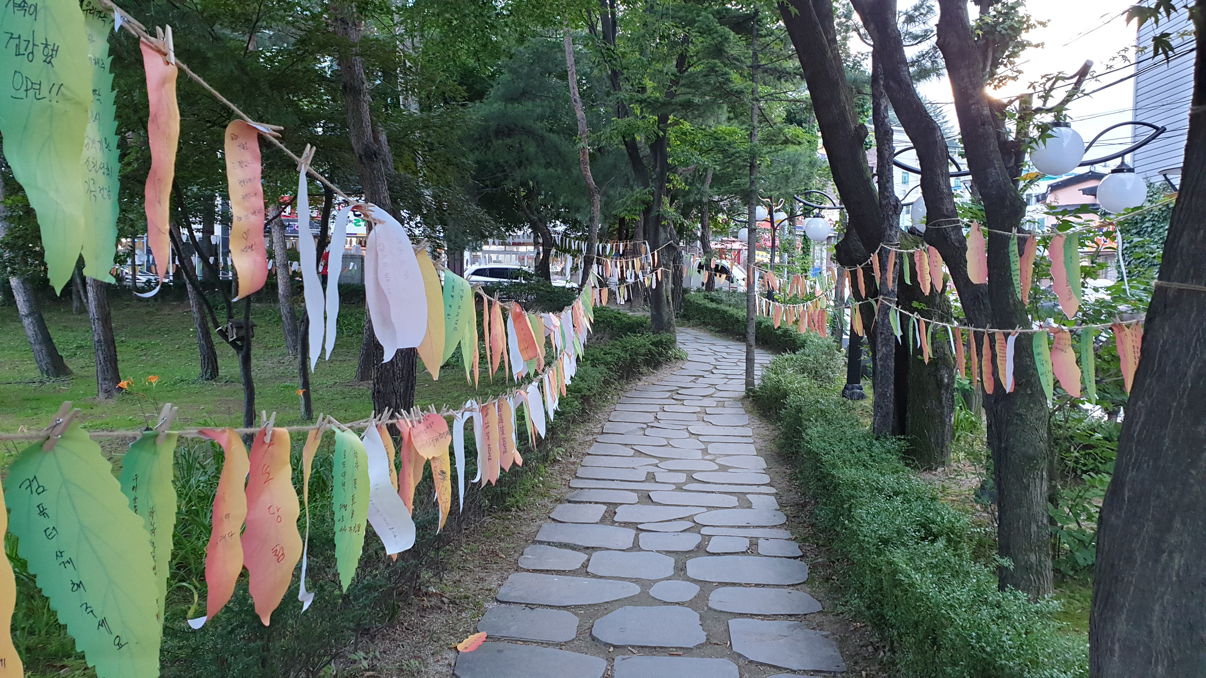 차를 세워두고 연못쪽으로 걸어가는 동안 색색깔 예쁜 나뭇잎 모양의 소원지에 소망을 적어 걸어둔 것이 보였다.