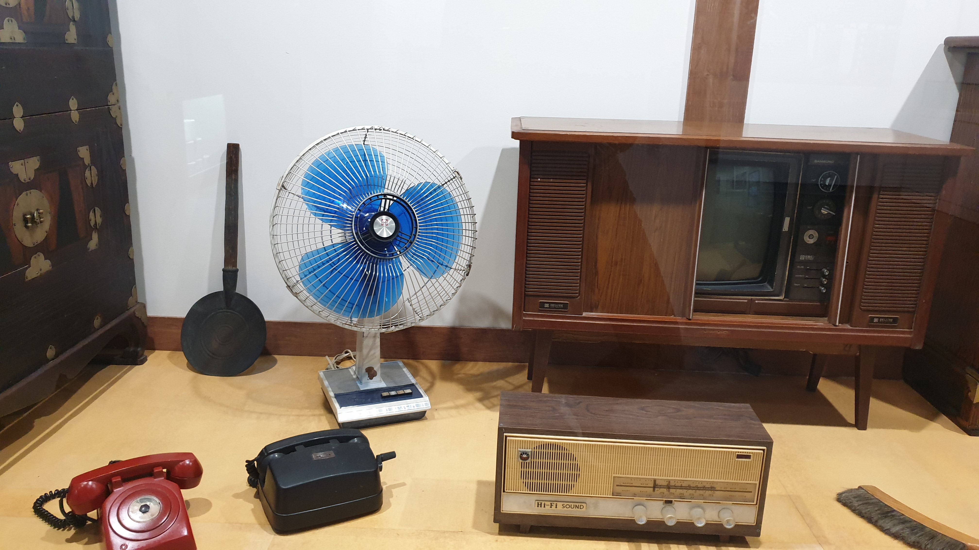 옆으로 밀어서 열고 닫는 미닫이문이 달린 텔레비전과 선풍기, 다이얼을 돌리는 전화기.