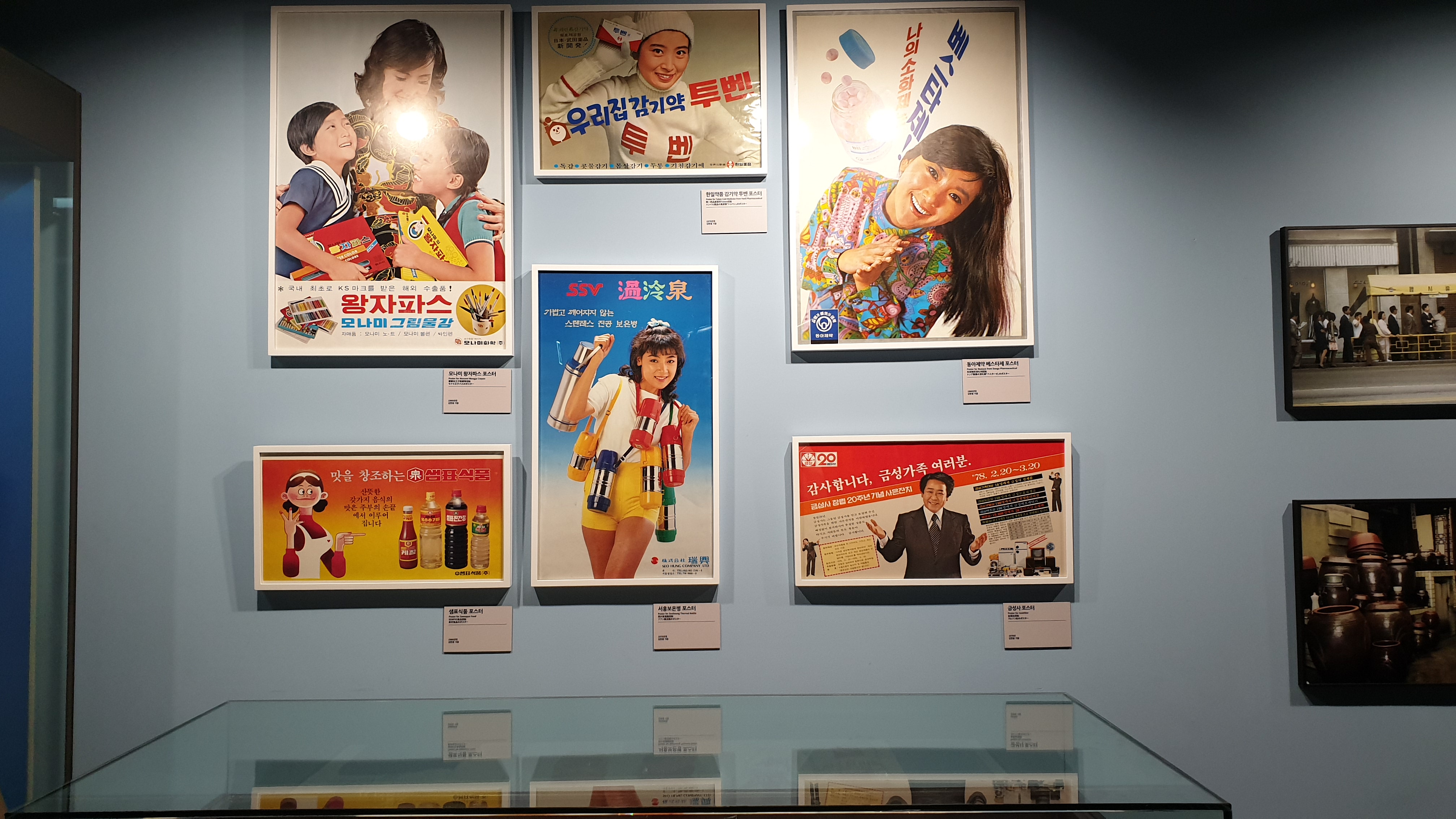 제품 광고 포스터가 전시되어 있다. 그 아래에는 삼양라면과 미원이 있다. 삼양라면도 그렇지만 미원도 포장디자인이 그 때나 지금이나 변함없이 한결 같네.