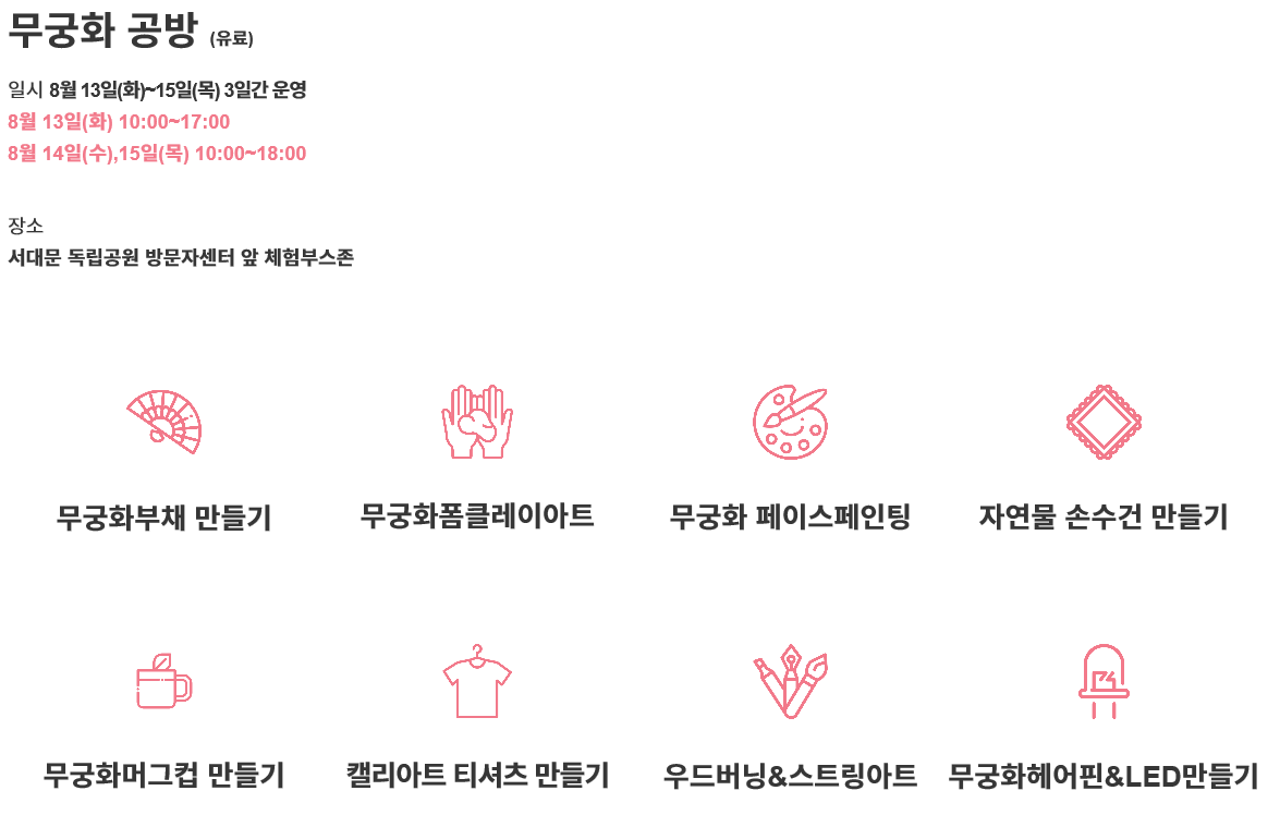 나라꽃 무궁화와 대한민국 임시정부수립 100주년을 기념하기 위해 다양한 볼거리와 프로그램을 통해 무궁화를 자유롭게 보고 체험할 수있는 2019서울 무궁화축제가 오는8월8일 부터 15일가지 개최됩니다.