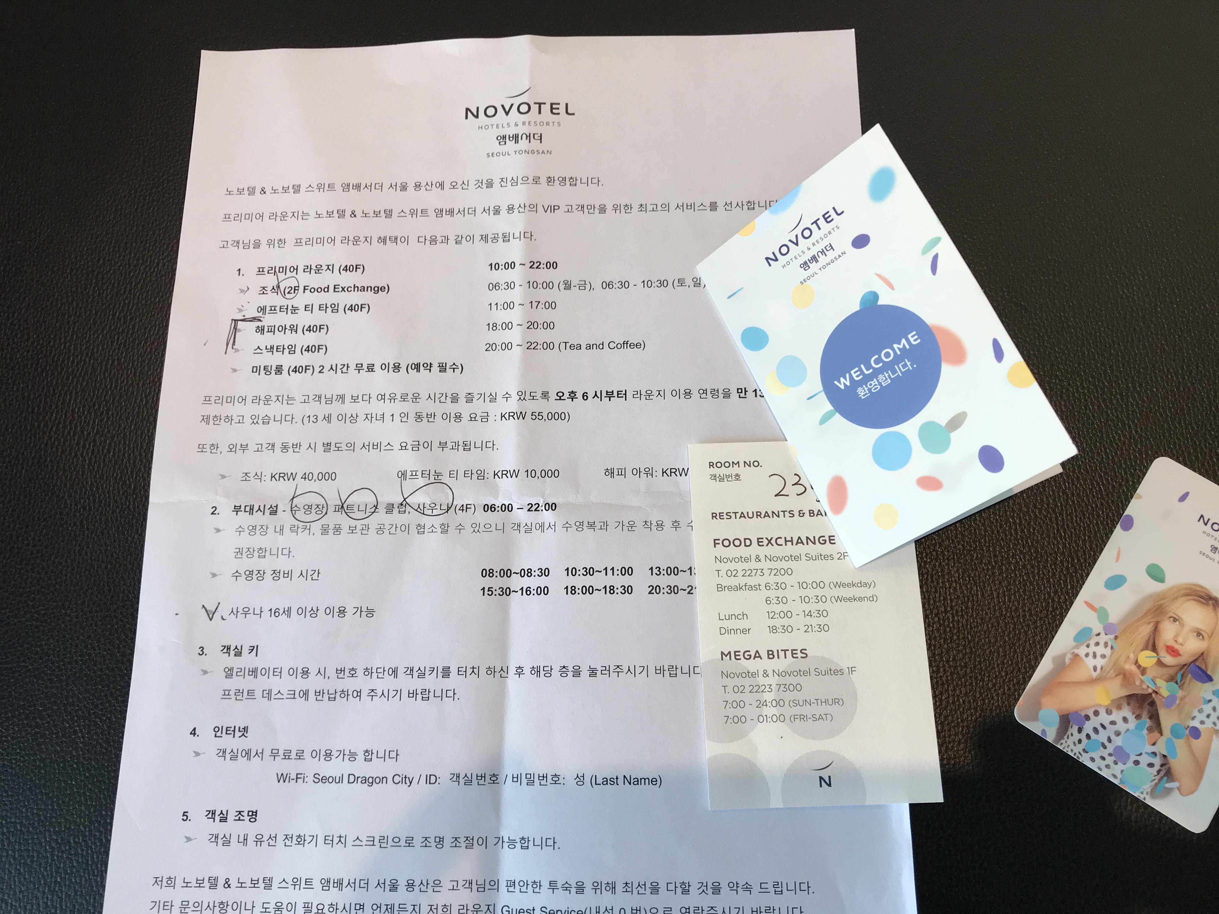 체크인 할 때 객실 카드키와 함께 안내서를 준다. 말로 아무리 설명해줘도 돌아서면 잊어버리게 되는데 한 눈에 보기도 편하고 다시 되묻지 않아도 돼서 좋았다.