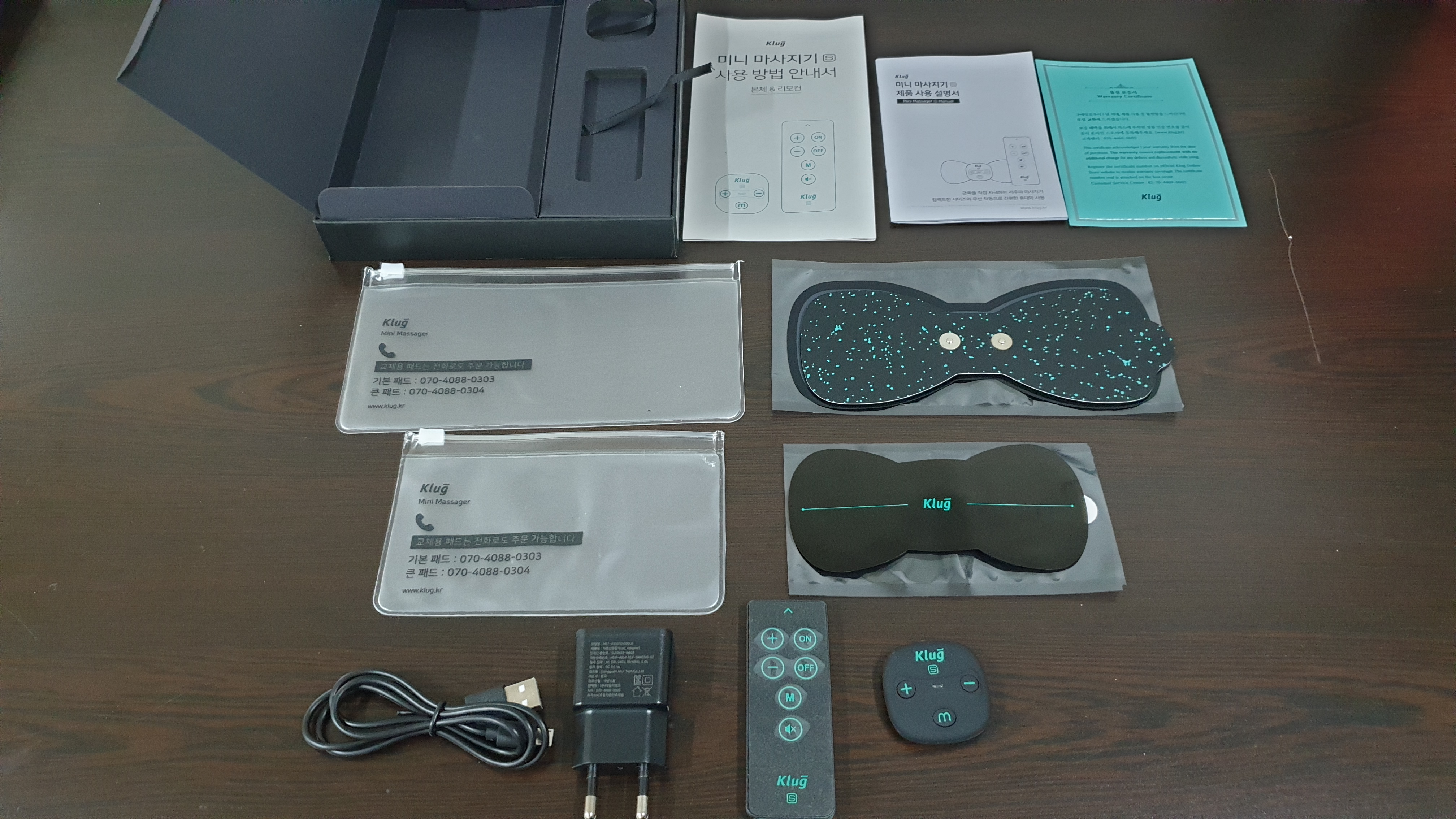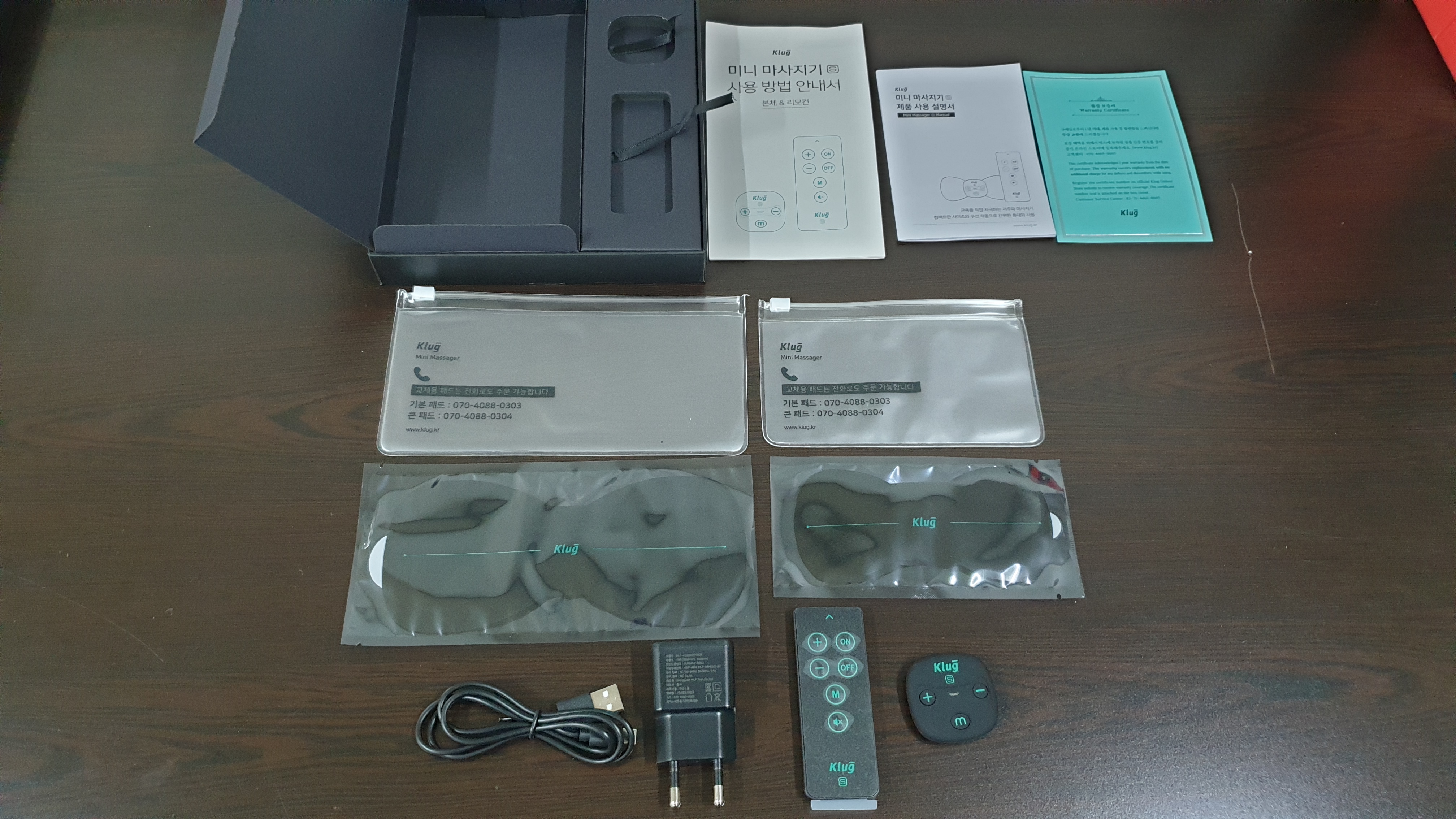 미니 마시지기 클럭 본체와 리모컨, 베이직 패드, 라지 패드, 충전기