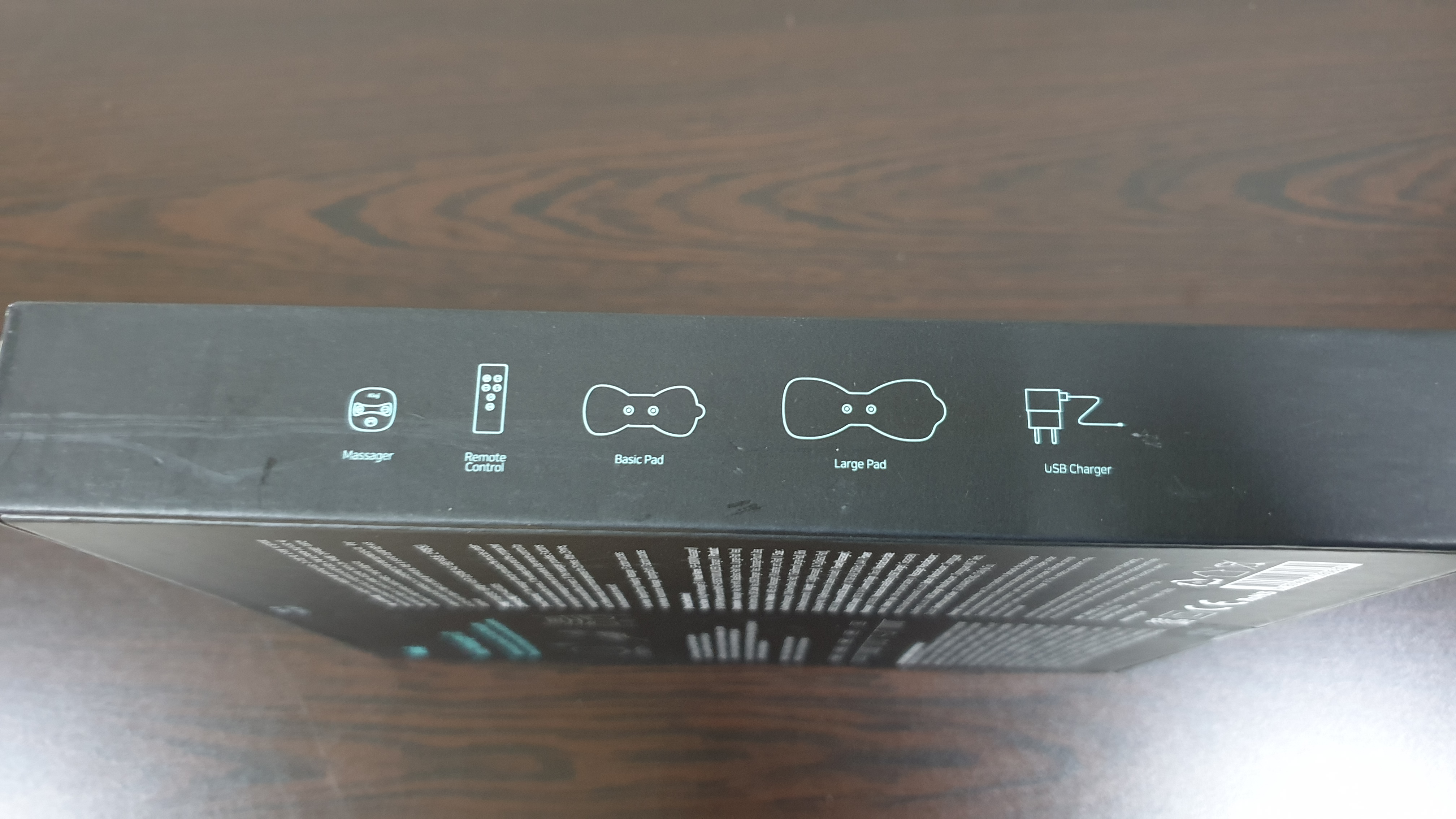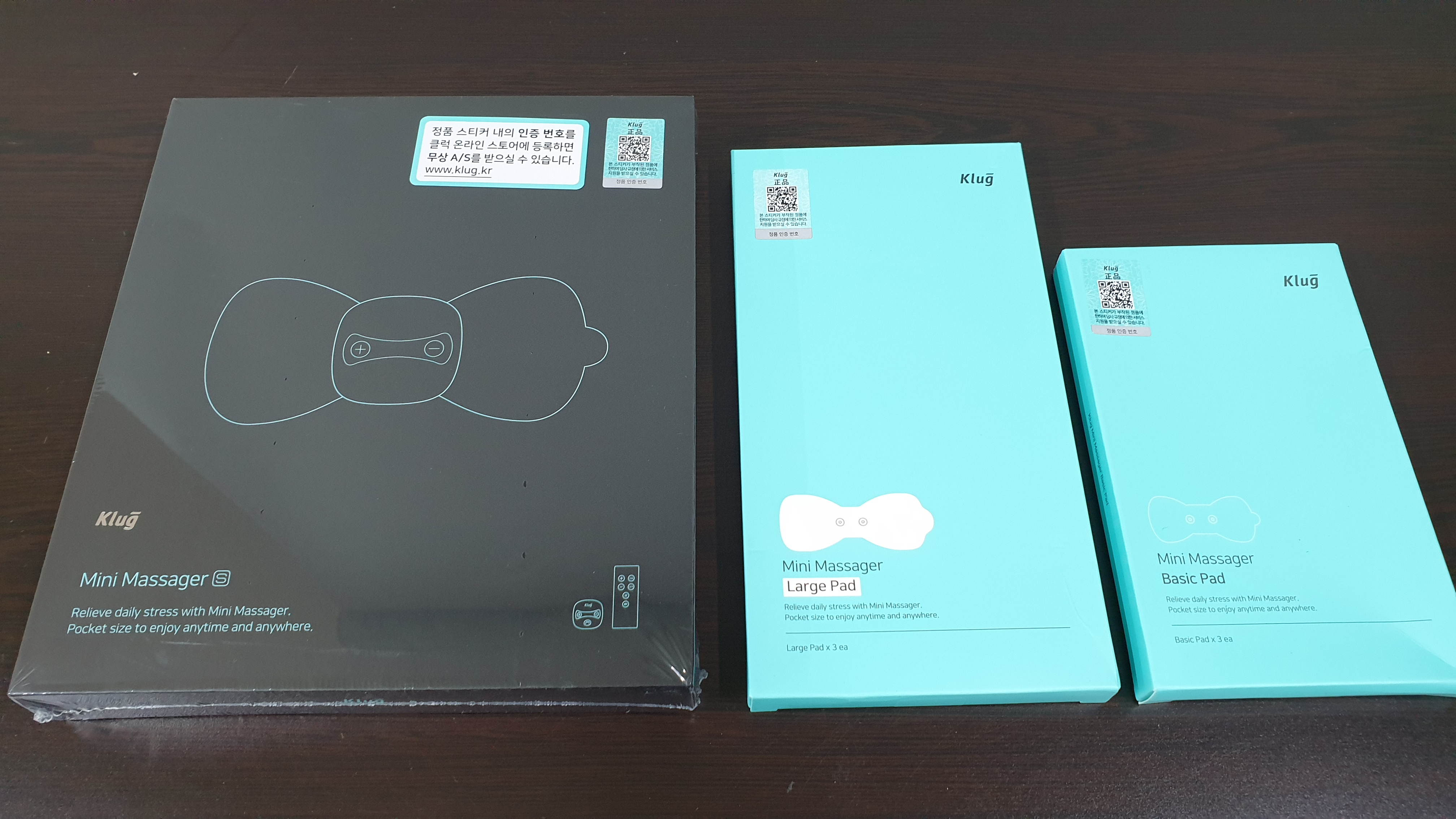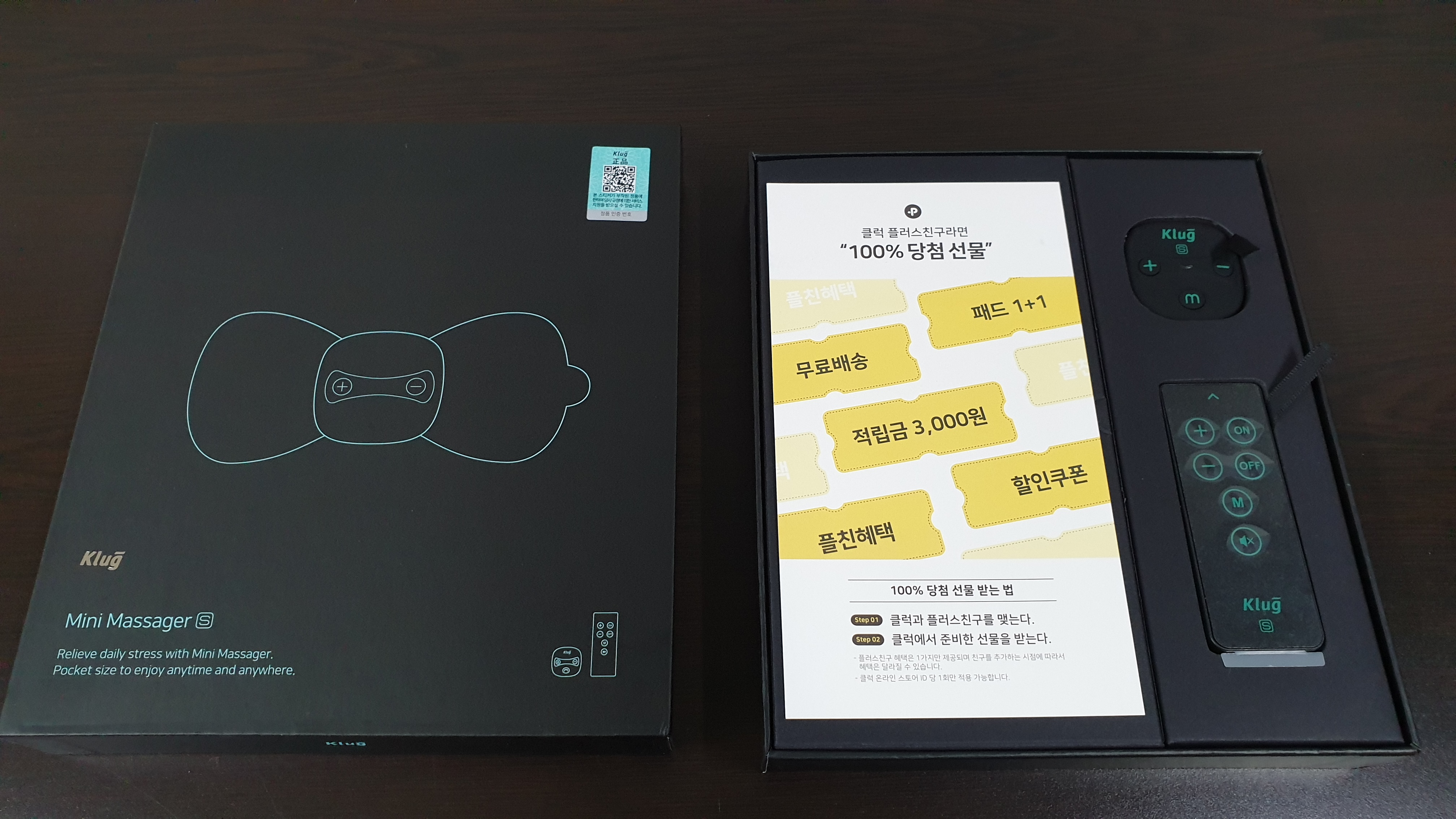 본품(본체+리모컨), 패드 2개의 깔끔한 패키지 앞면과 뒷면