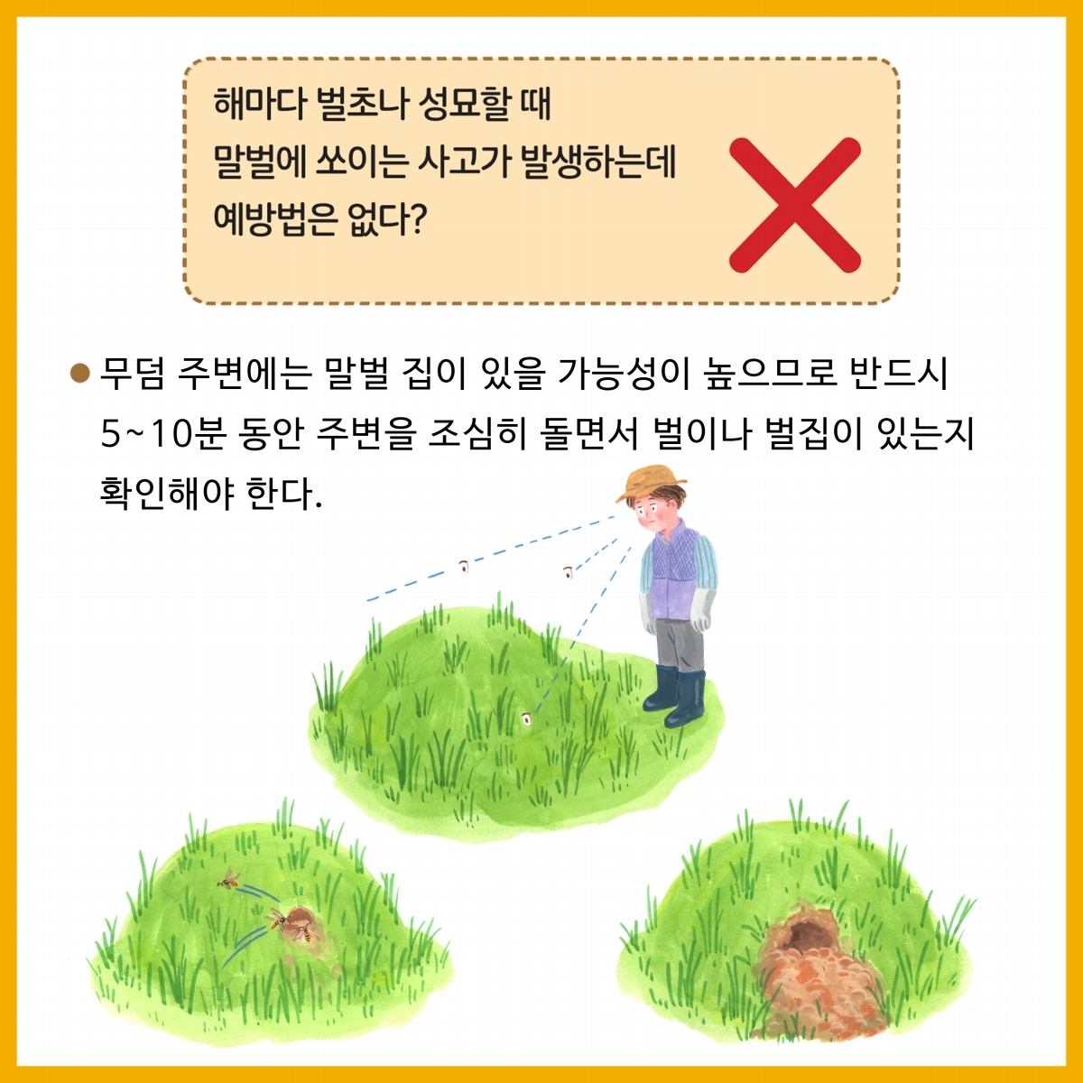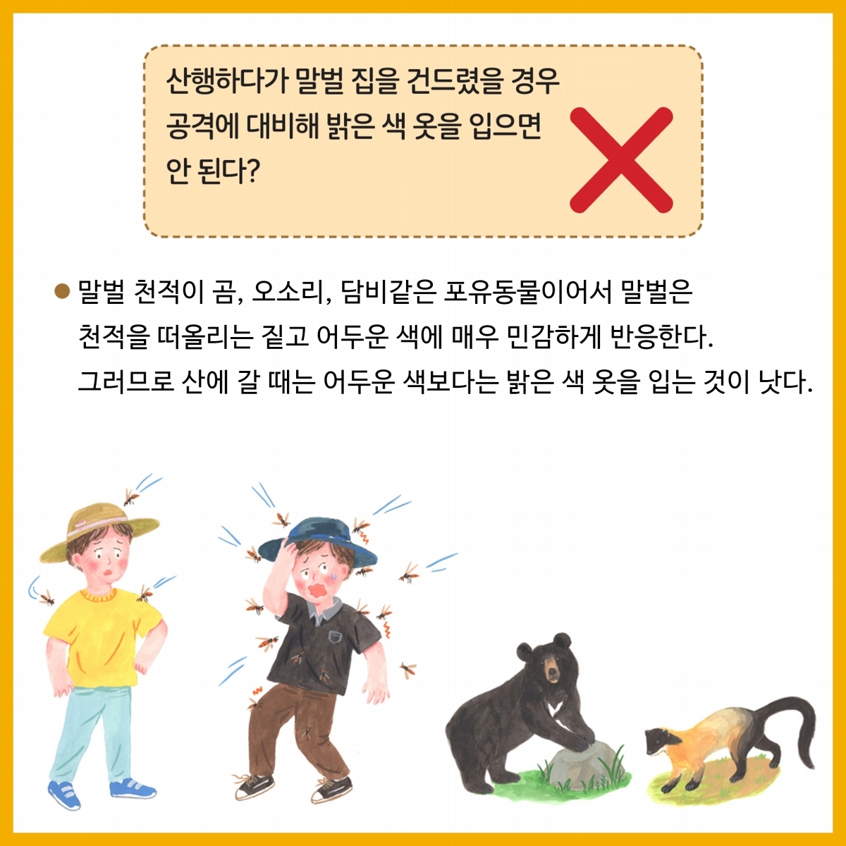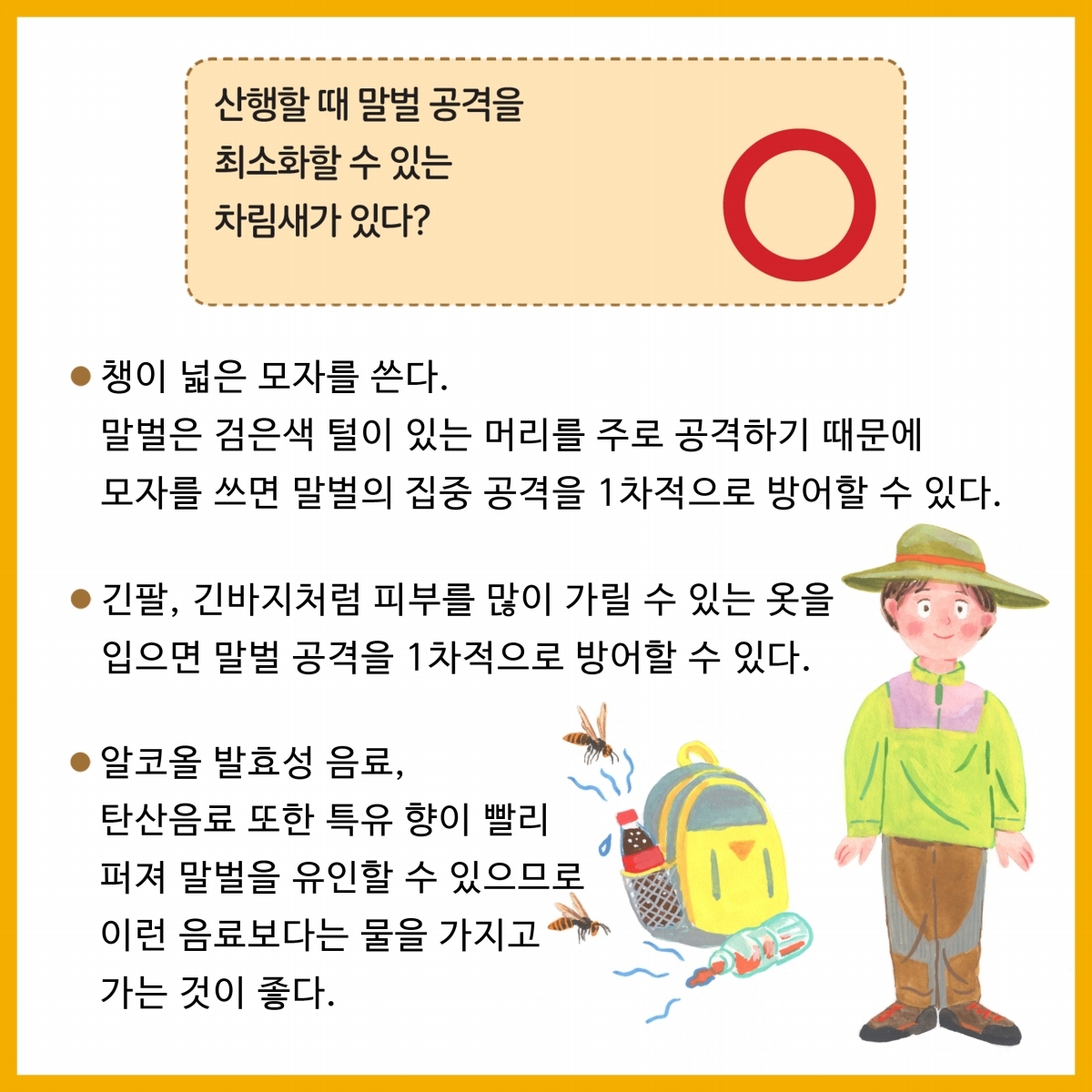 6.마지막으로 야외 활동 시 되도록 긴 옷(밝은색)과 모자를 착용하고, 향수 및 화장품 사용은 자제하는 것이 말벌 쏘임 사고를 예방할 수 있는 가장 기본적인 방법이다.