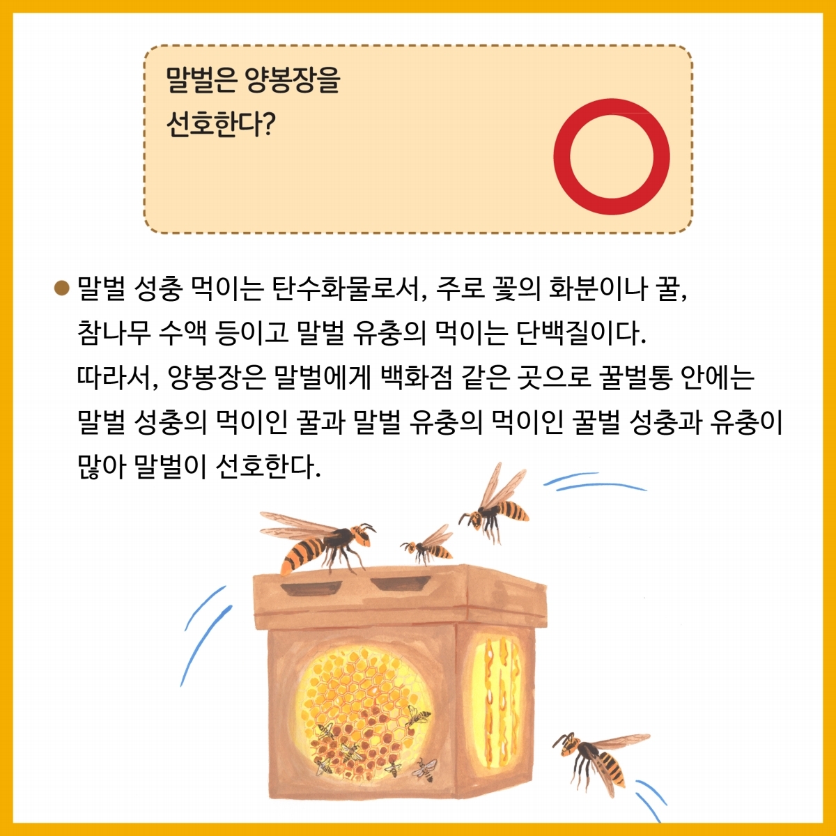1.말벌은 초여름 벌집 내 일벌들의 개체수가 급격히 증가하여 벌집이 점점 커지고 10월말까지 왕성한 활동을 한다.