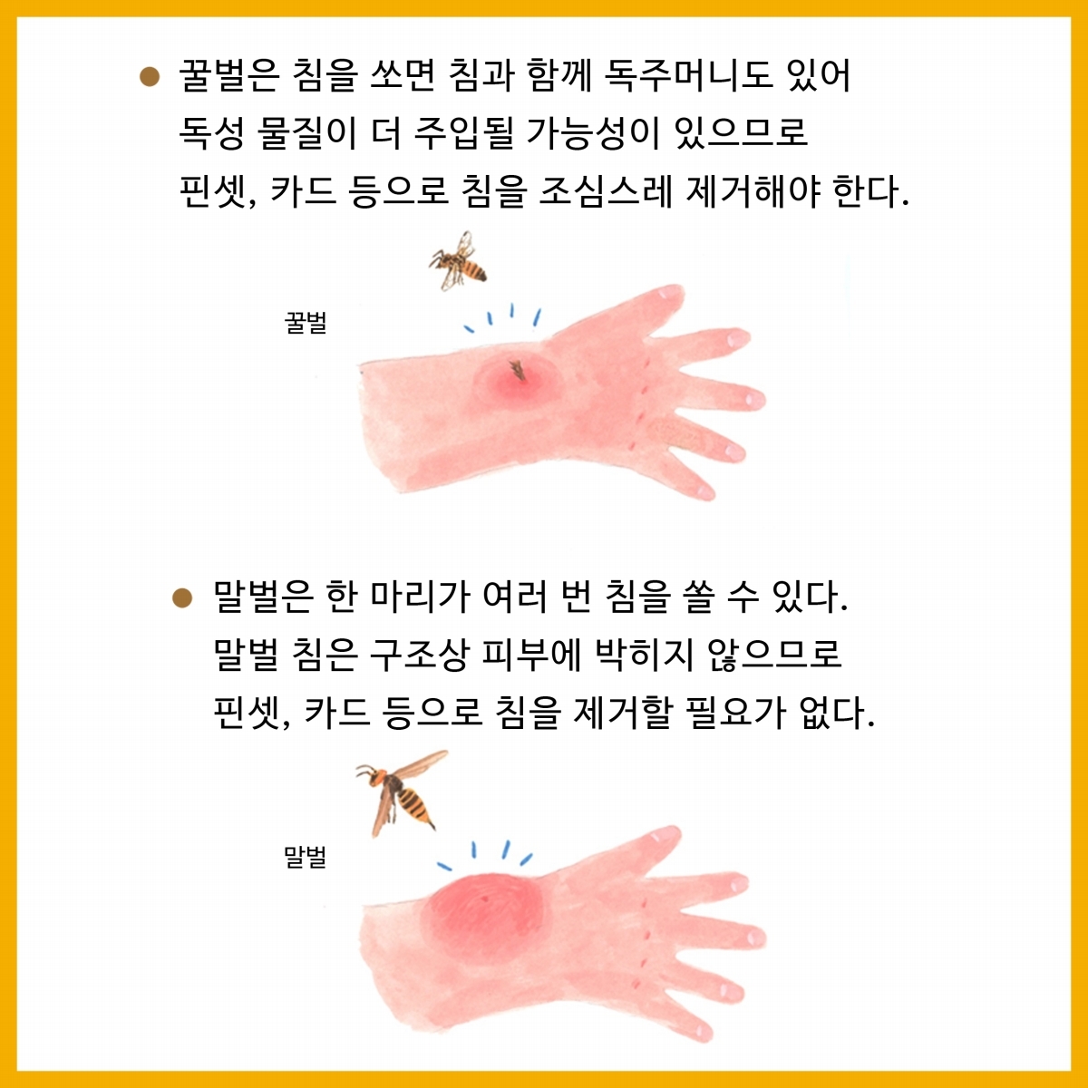3.또한, 말벌 침의 구조상 독침이 피부에 남지 않으므로 핀셋, 카드 등으로 침을 제거하지 않아도 된다. 쏘임과 동시에 통증 부위를 즉시 차가운 물이나 얼음으로 환부를 씻어 통증과 독의 확산을 지연시킨 후, 가까운 약국이나 병원과 같은 의료시설에서 필요한 조치를 받아야한다