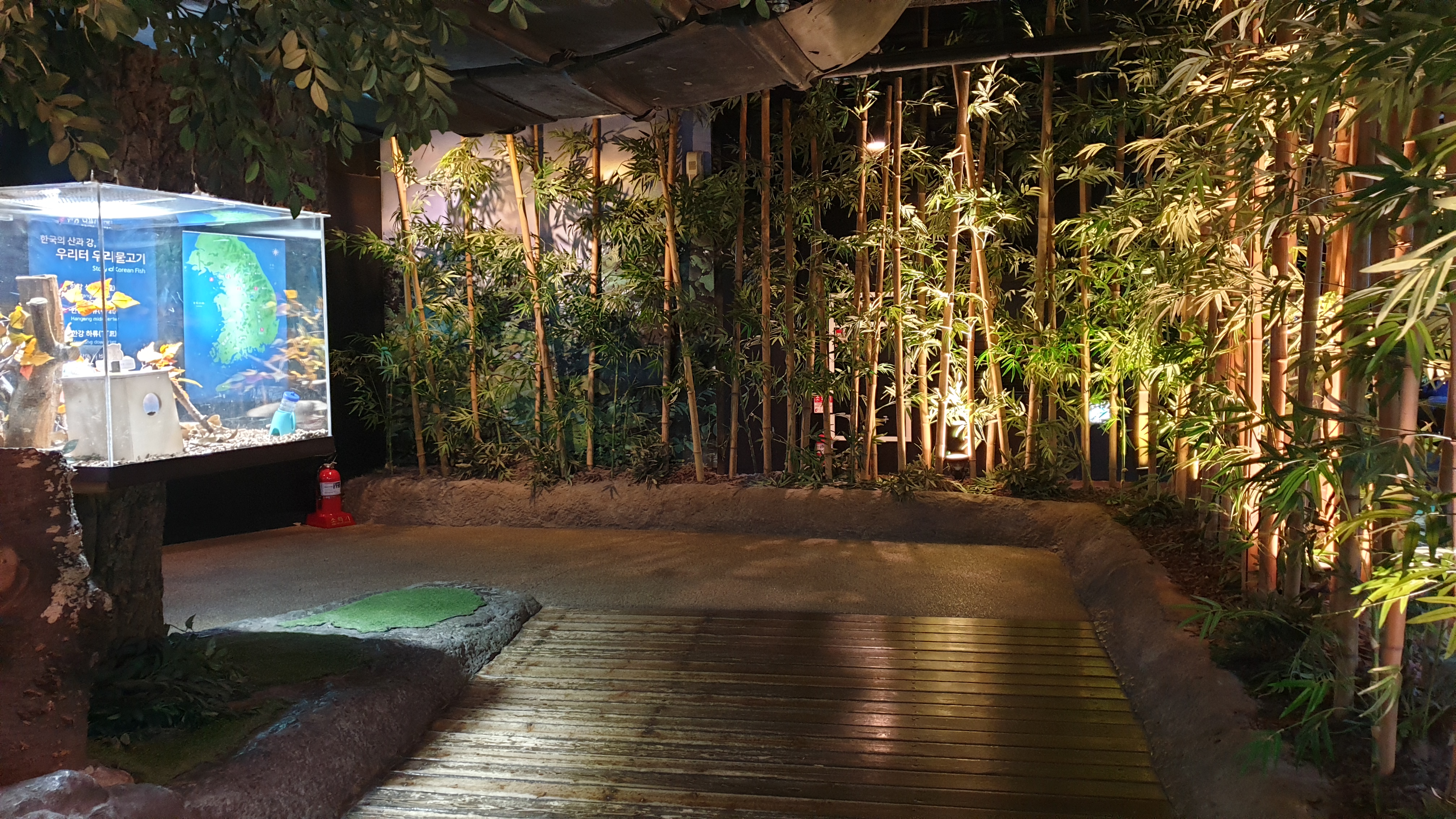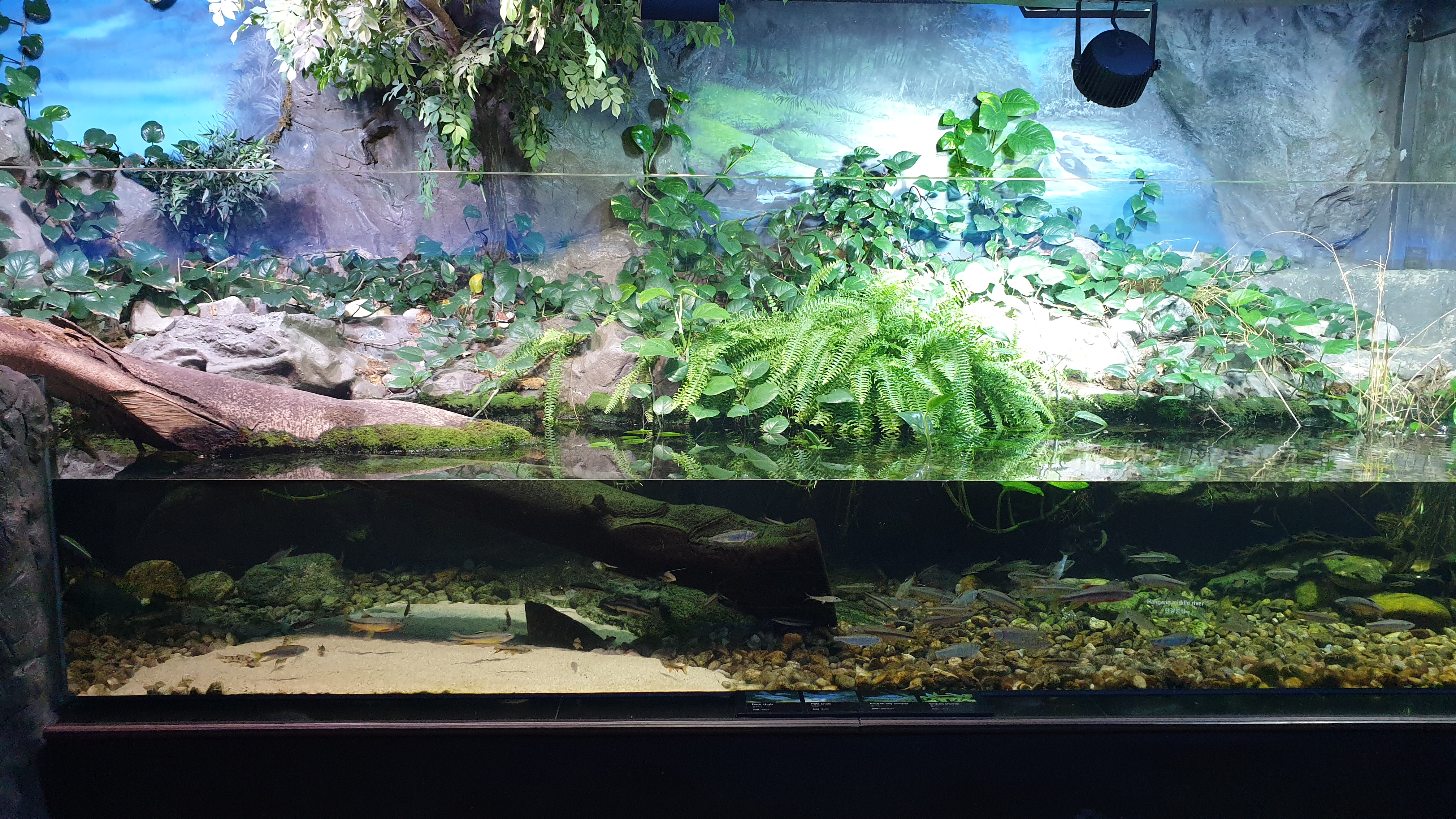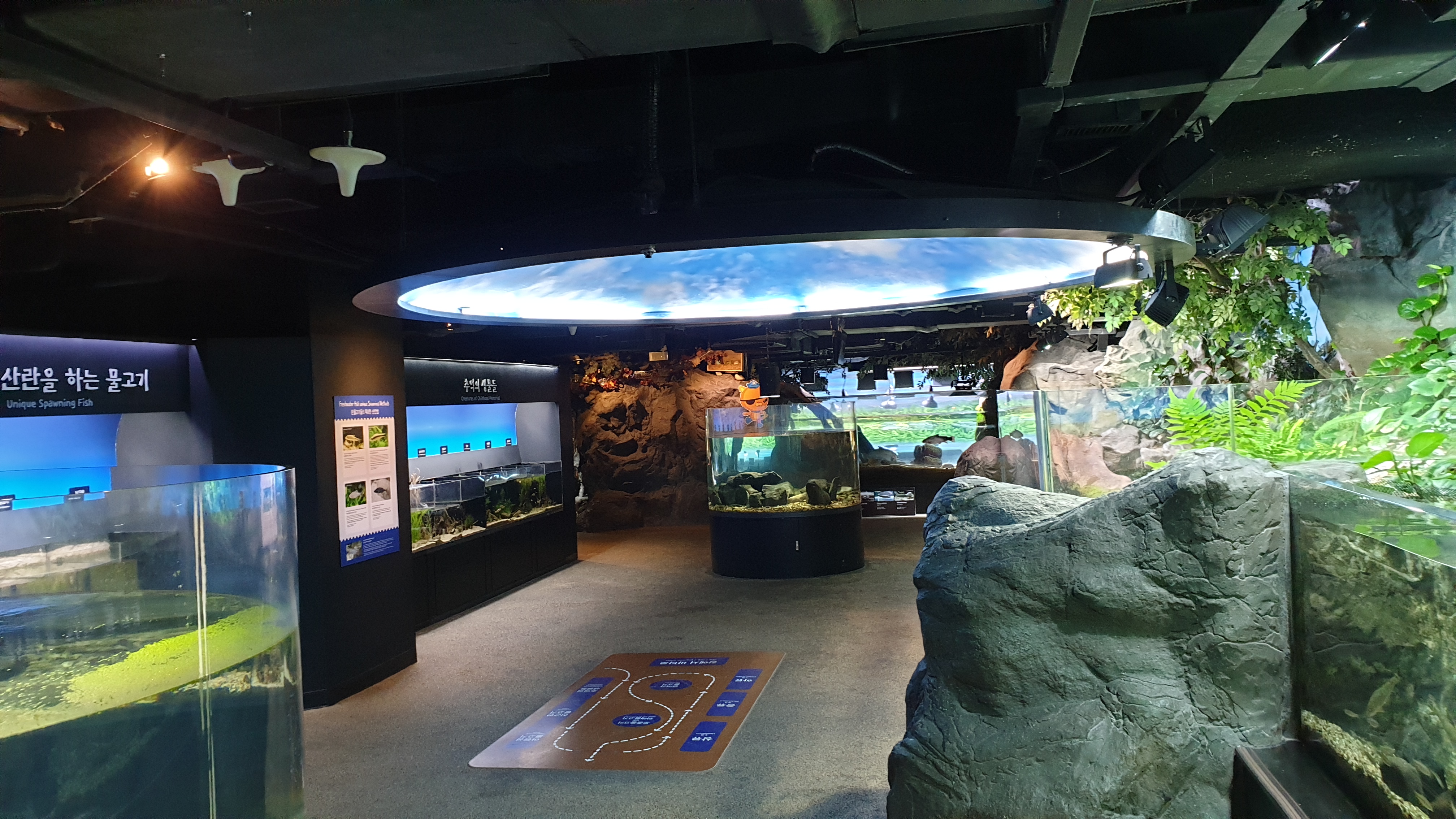 강에서 시작해 바다로 나아가는 수중 여행 컨셉으로 구성된 전시관이라서 우선 민물에서 시작한다. 강으로 흘러가기 전, 논에 물을 대기 위해 옆에 조그많게 파두는 둠벙에서 시작해 계곡의 상류-중류-하류를 따라 댐에 이르기까지 민물의 흐름을 따라 가는 구성이다.