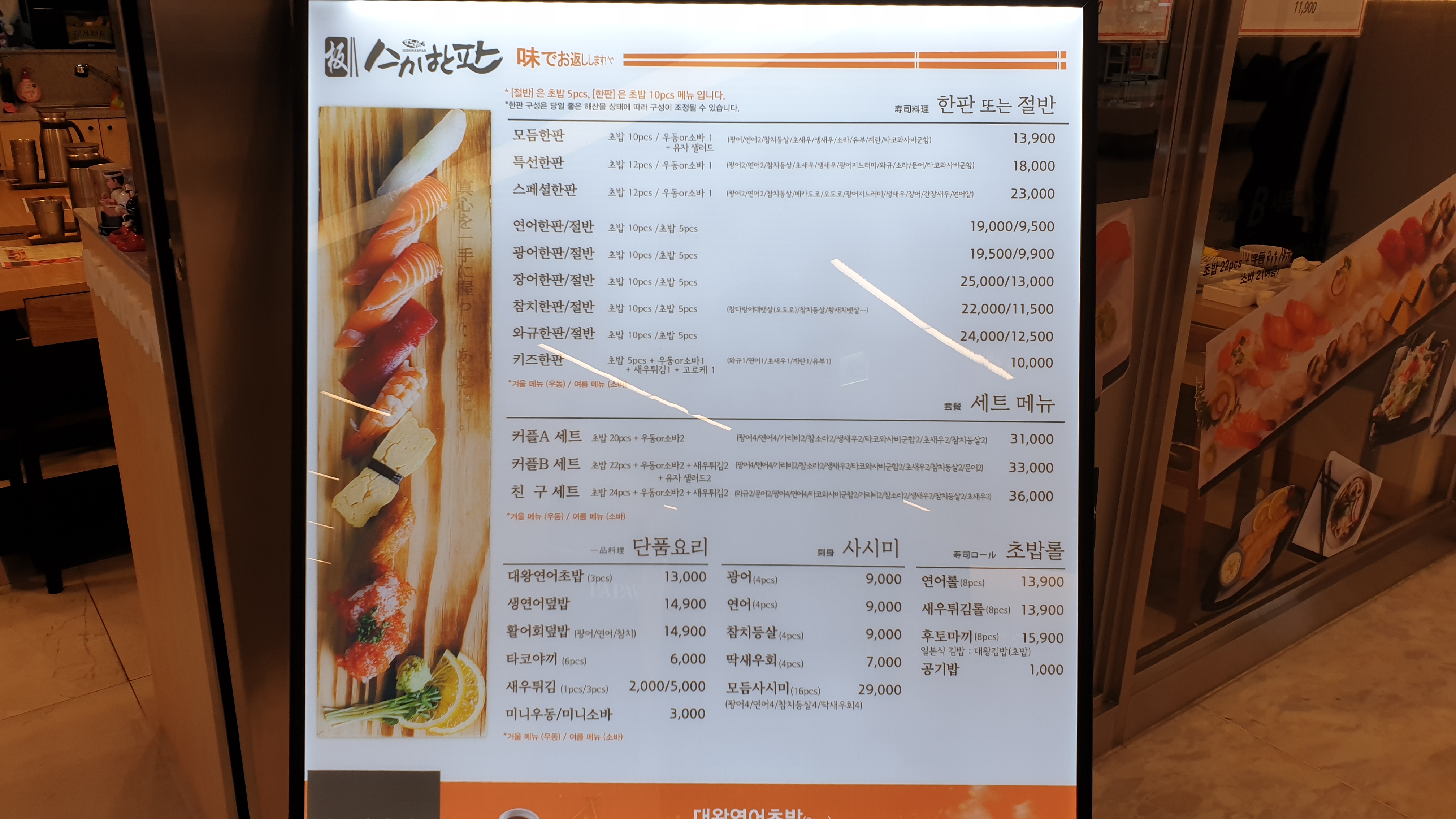 긴 나무 판위에 모듬초밥이 올려져 나오는 초밥 전문점.