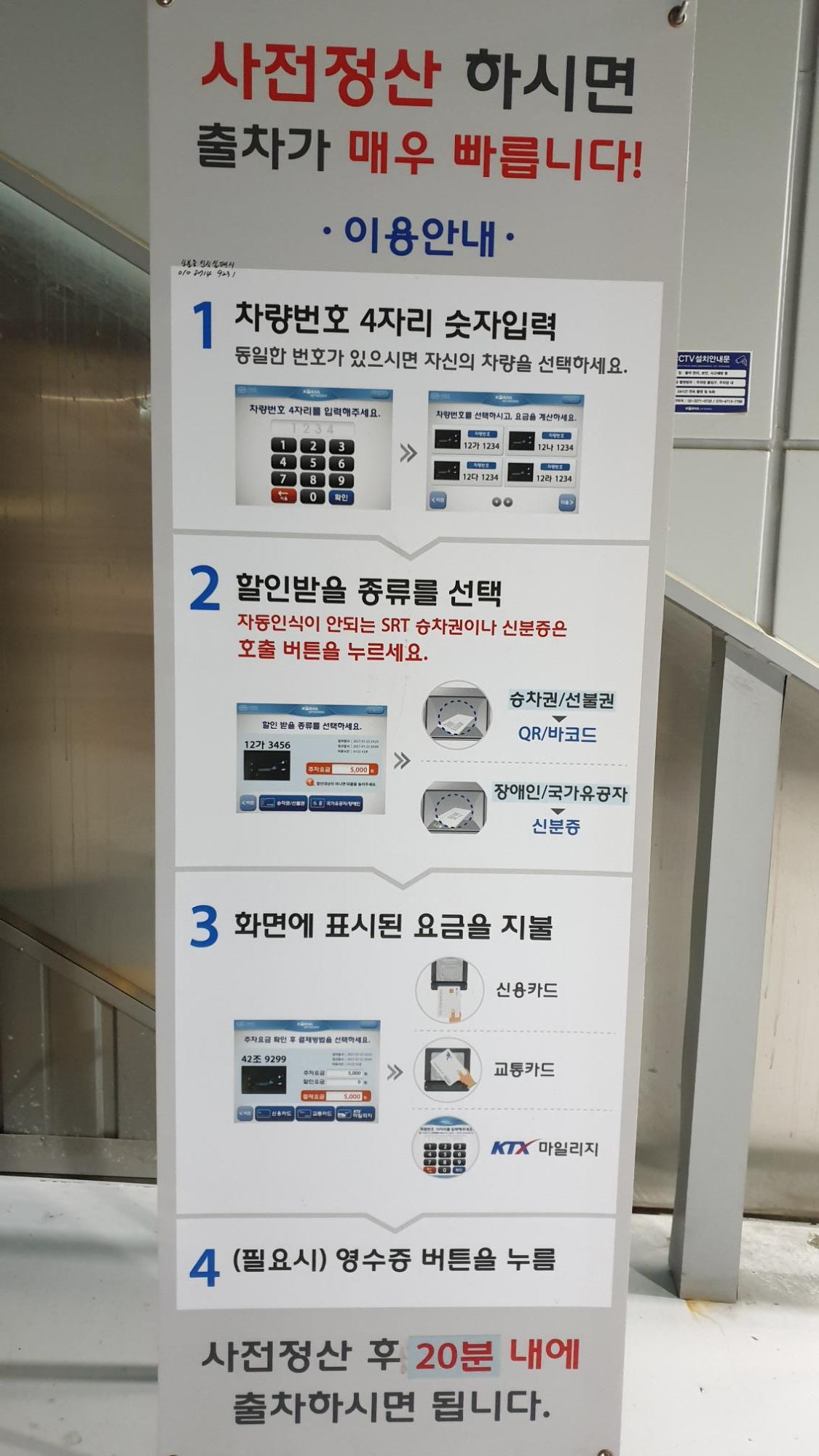 출차 전 사전 정산 후 20분 내에 출차하면 추가요금 없으므로 주차요금 먼저 결제 후 출차하면 된다.