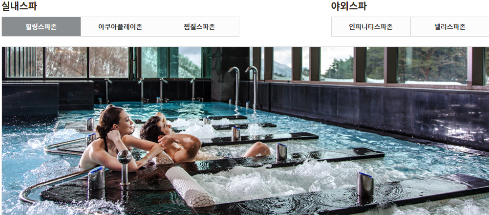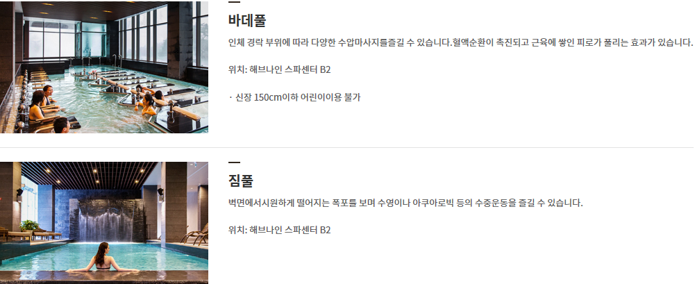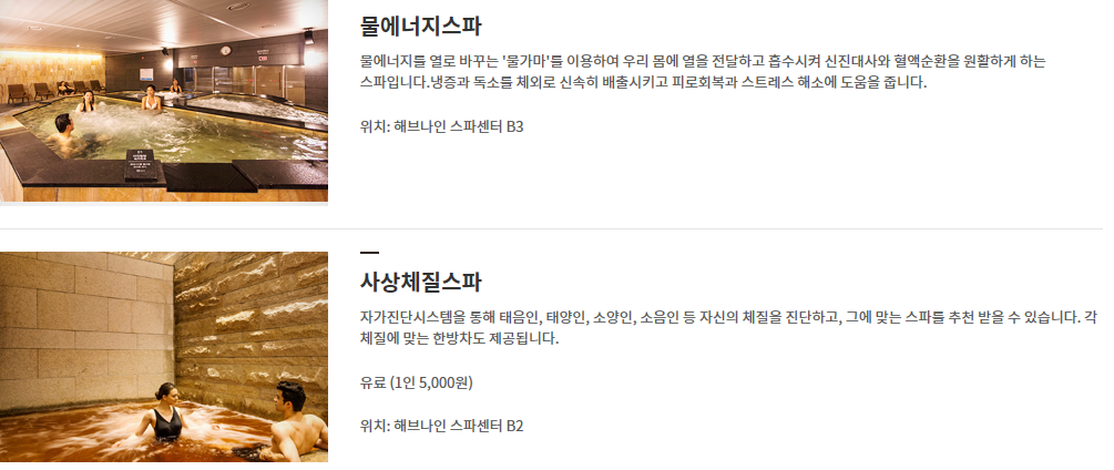 | 아쿠아힐링 | 하이드로테라피, 스파, 아쿠아헬스, 노천스파, 수영 등 |
