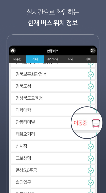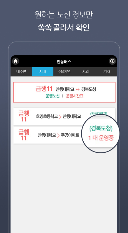 1. 현재 운행중인 안동 시내버스 전 노선 검색가능(도착정보없음 노선은 비노출)
