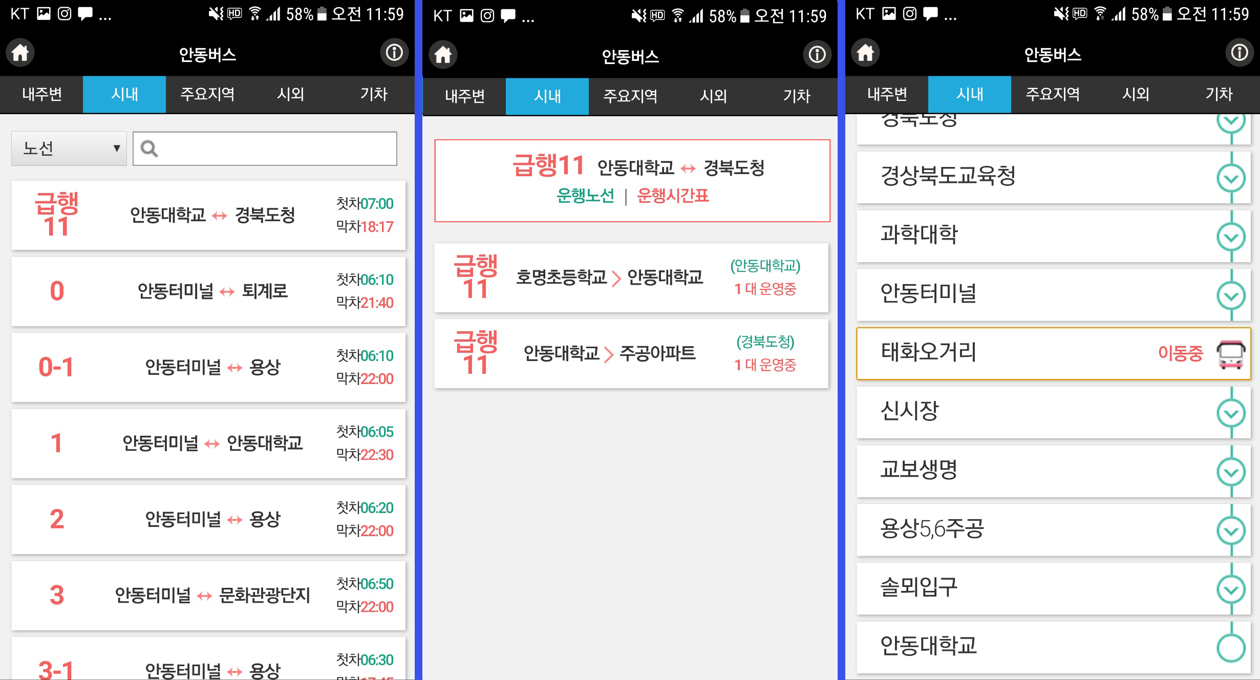 3. 급행11번 안동대방향 버스가 태화오거리 이동중