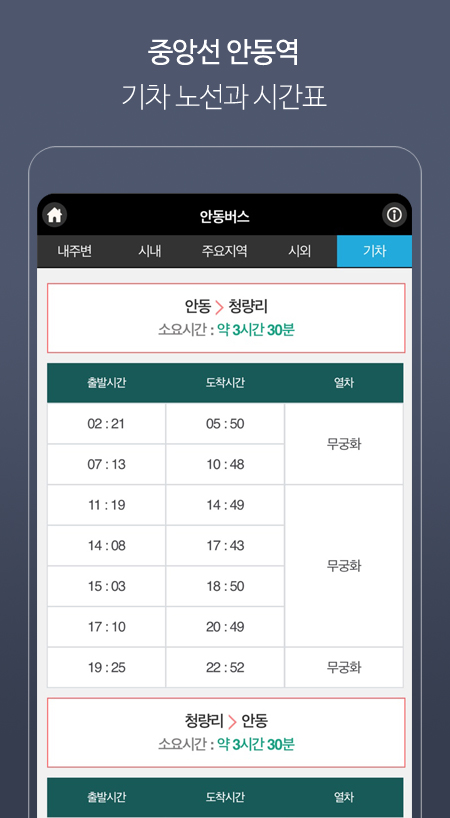 3. 안동시 기차시간표 확인 가능