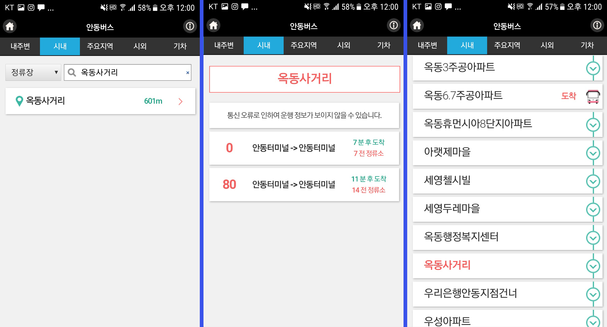 1. 시내 정류장으로 검색 가능 '옥동사거리'